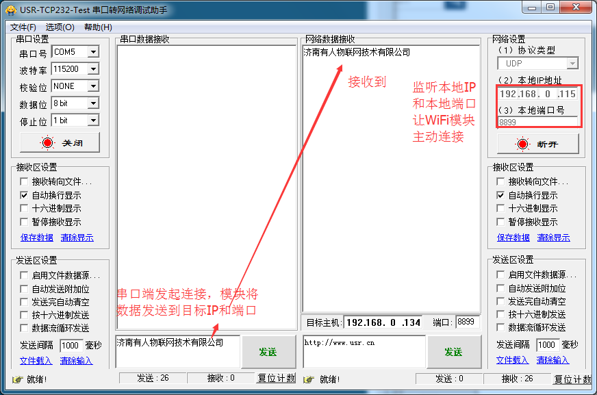 2:串口測(cè)試,將WiFi模塊連接到電腦的串口上,電腦的設(shè)置管理器上顯示為COM5.測(cè)試串口向網(wǎng)絡(luò),網(wǎng)絡(luò)向串口端的數(shù)據(jù)透?jìng)鳌?/p>