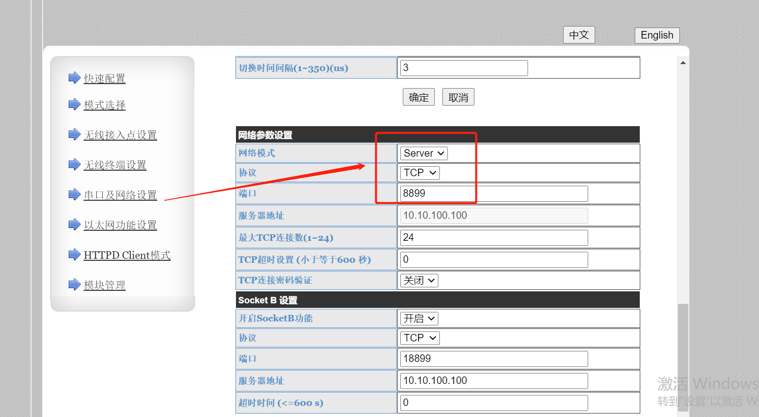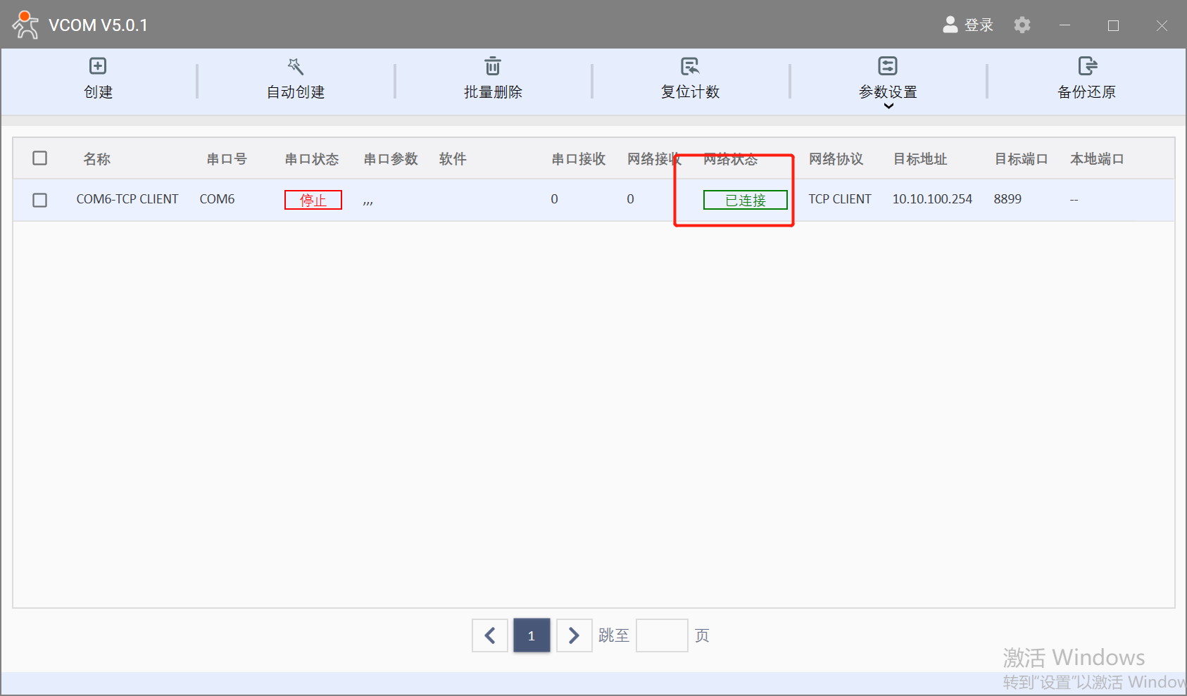 4.設(shè)置虛擬串口軟件為tcp client 目標IP為10.10.100.254 目標端口8899