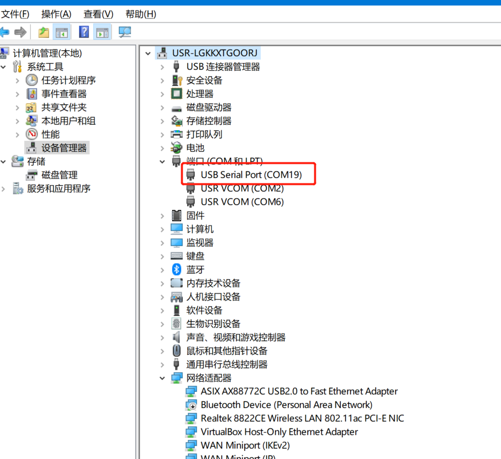 5.可以看到網(wǎng)絡(luò)狀態(tài)為已連接,在設(shè)備管理器找到232轉(zhuǎn)USB的端口號為com19