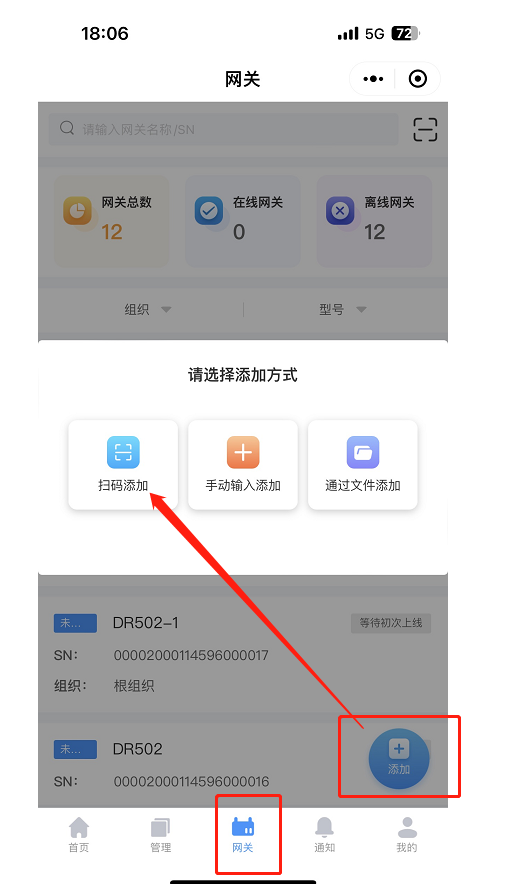 4、若批量購買網(wǎng)關設備,可以掃描紙質出貨單上方的“掃碼即可上云”二維碼批量添加網(wǎng)關設備