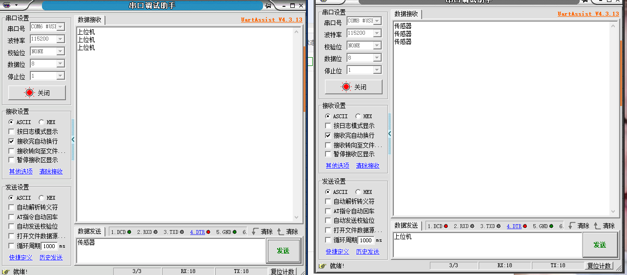 在電腦上打開兩個串口助手的測試軟件,分別去調用設備管理器中生成的端口。此案例中使用com6的串口助手模擬的傳感器。虛擬串口com8、串口助手模擬上位機調用com8讀取傳感器的數(shù)據(jù)??梢钥吹缴衔粰C與傳感器的數(shù)據(jù)交互。