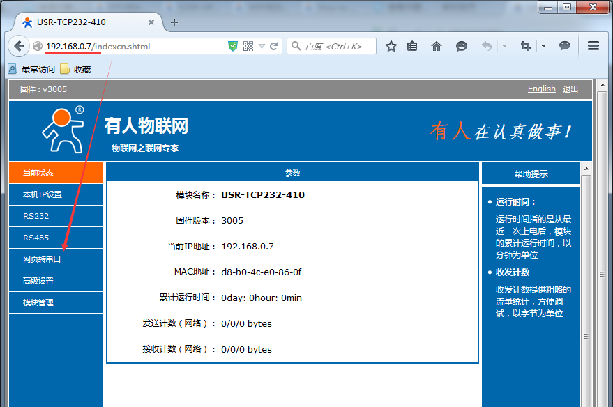 2:進入串口服務(wù)器的配置網(wǎng)頁:192.168.0.7.用戶名和密碼都是admin。找到網(wǎng)頁轉(zhuǎn)串口