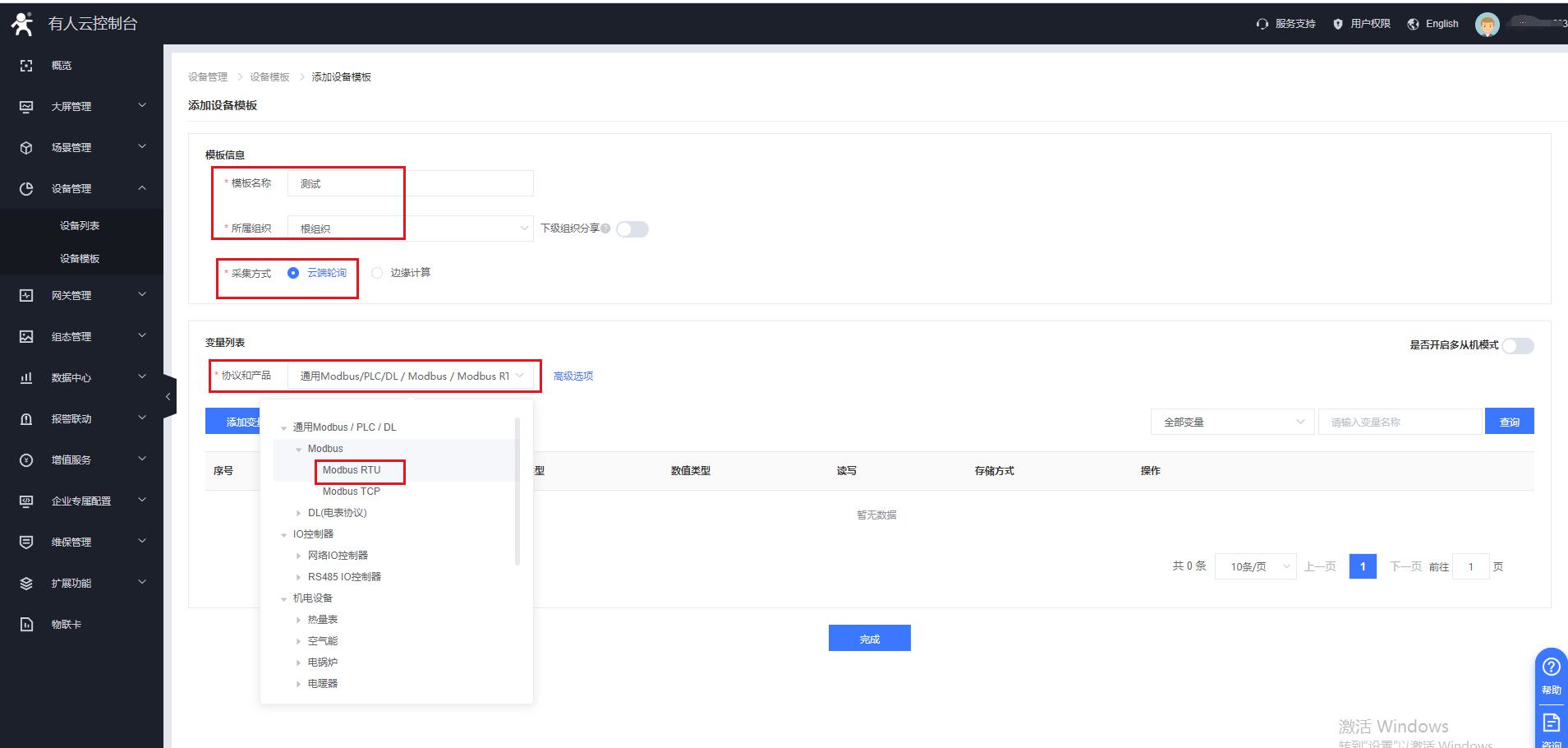 3.設(shè)備管理——設(shè)備模板,添加模板,選擇云端輪詢,modbus rtu協(xié)議,測試從機地址為1,寄存器為40001,選擇不采集,主動上報,配置完確認(rèn),完成。