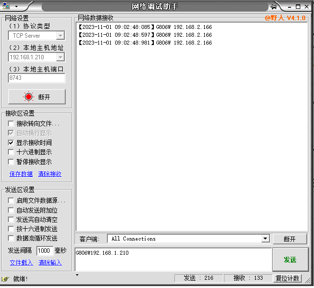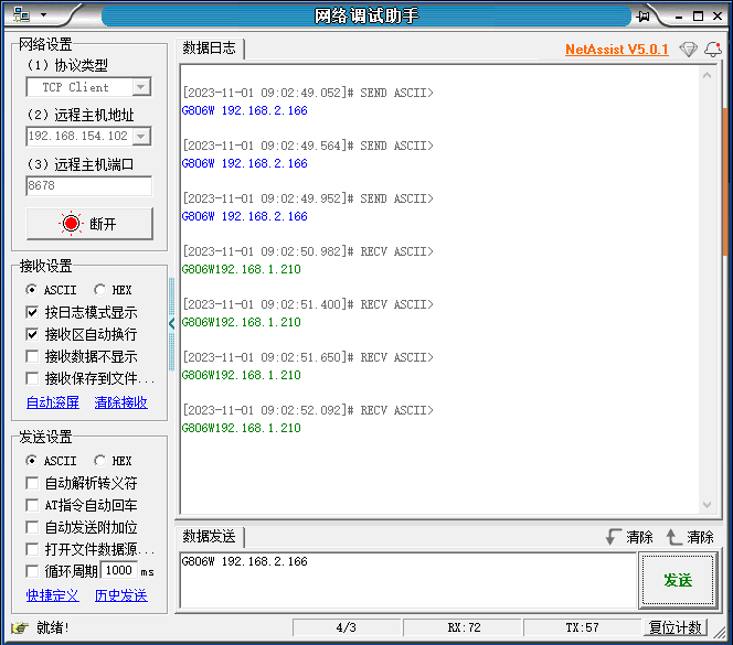 PC2即806w(B)的內(nèi)網(wǎng)電腦,打開網(wǎng)絡(luò)調(diào)試助手,做tcp clinet端,IP設(shè)置806(A)獲取到的4G專網(wǎng) IP,端口設(shè)置為端口轉(zhuǎn)發(fā)的外部端口。能夠連接到 4G 路由器下的 TCP Server 并進行通信。