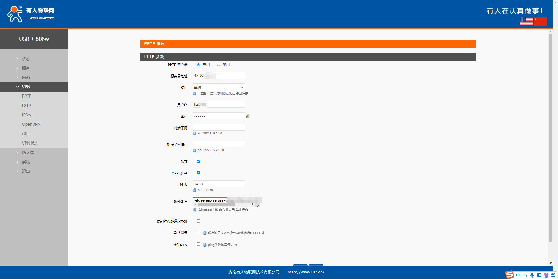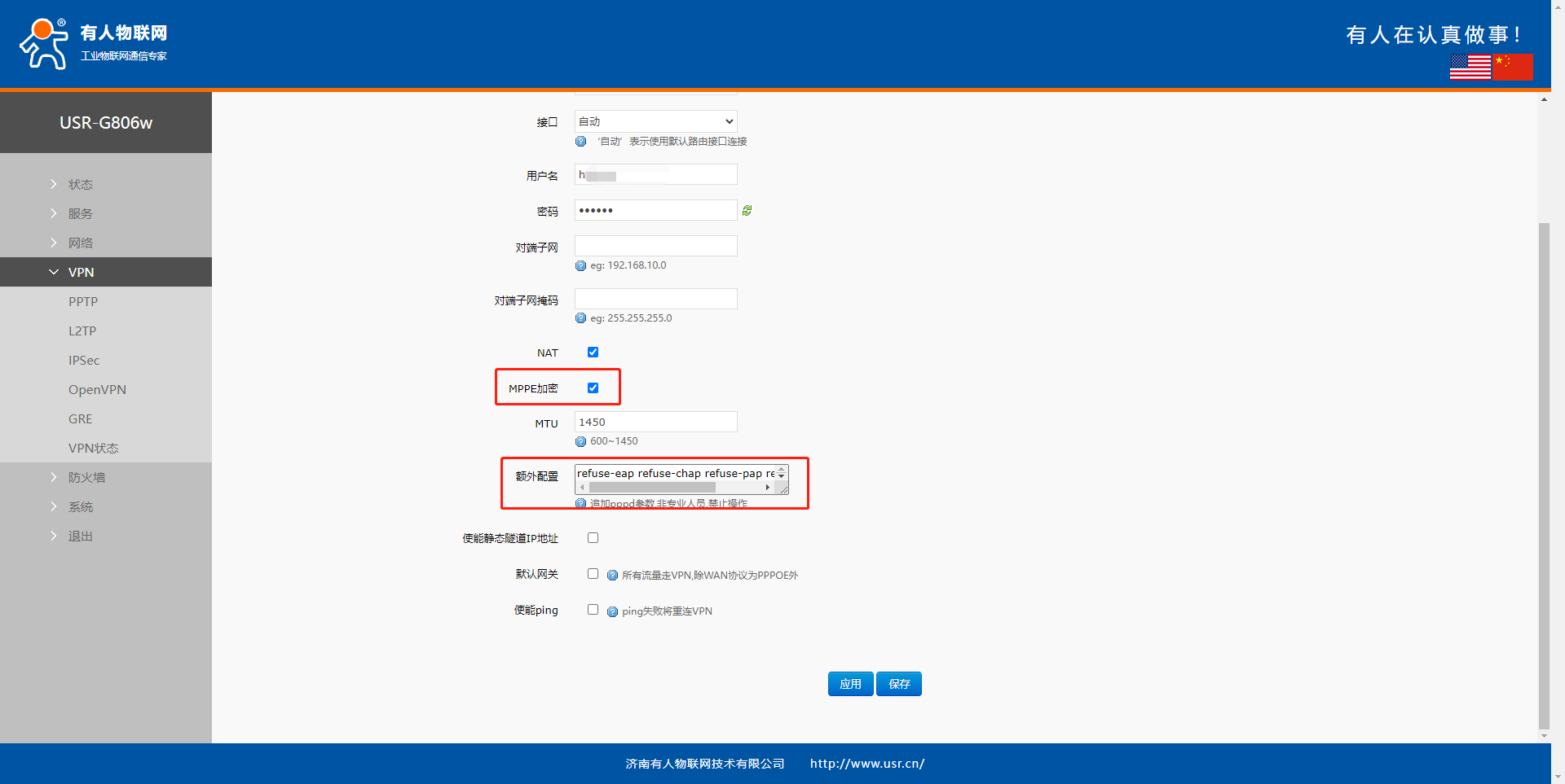 4>.加密方式與VPN服務(wù)器對應(yīng),其中加密方式可選:mppe stateful有狀態(tài)連接:會進行頻繁更換密鑰,且在更換密鑰時會出現(xiàn)嚴(yán)重丟包;mppe stateless無狀態(tài)連接:只有在丟包的時候會進行密鑰更改;no mppe服務(wù)端無 MPPE 加密方式時選擇此模式。額外配置:當(dāng)以上配置不滿足配置文件和服務(wù)端向匹配時在此添加附加配置。例如服務(wù)端 MPPE 認(rèn)證方式 為 only mschapV2,G806W 可在額外配置內(nèi)添加 refuse-eap refuse-chap refuse-pap refuse-mschap 配置