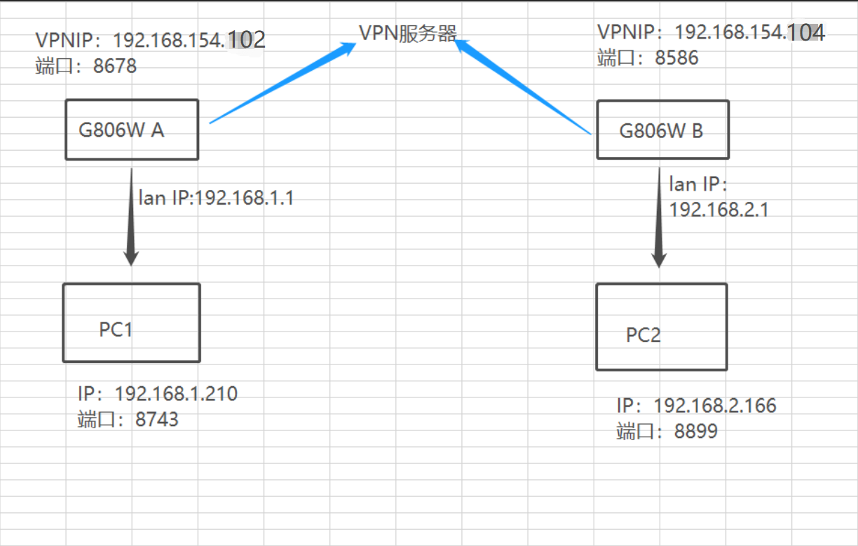 7>.到現(xiàn)在為止,兩臺G806W已經(jīng)連接上VPN了,連上同一個VPN服務(wù)器的客戶端之前可以相互訪問,所以現(xiàn)在VPN其他客戶端訪問G806W獲取到的VPN IP是通的,但是訪問不到G806W下的終端設(shè)備。所以就需要設(shè)置端口轉(zhuǎn)發(fā)或靜態(tài)路由,本案例設(shè)置的是端口轉(zhuǎn)發(fā)。需要G806W下的終端設(shè)置設(shè)備網(wǎng)關(guān)和DNS。
