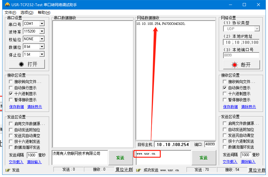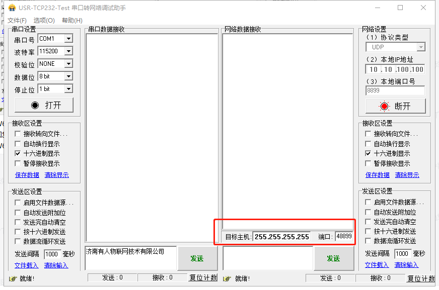 1.安裝并打開USR-TCP232-TEST測試工具,設(shè)置右側(cè)網(wǎng)絡(luò)端協(xié)議為UDP,本機(jī)IP設(shè)置為電腦鏈接W610wifi獲取的IP地址