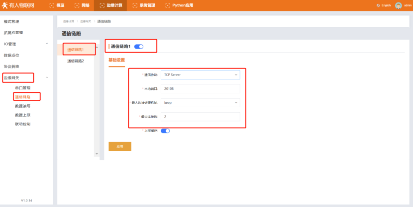 (3)點(diǎn)擊“邊緣網(wǎng)關(guān)”--“通信鏈路1”--設(shè)置“通信協(xié)議”TCP Server 和本地端口20108