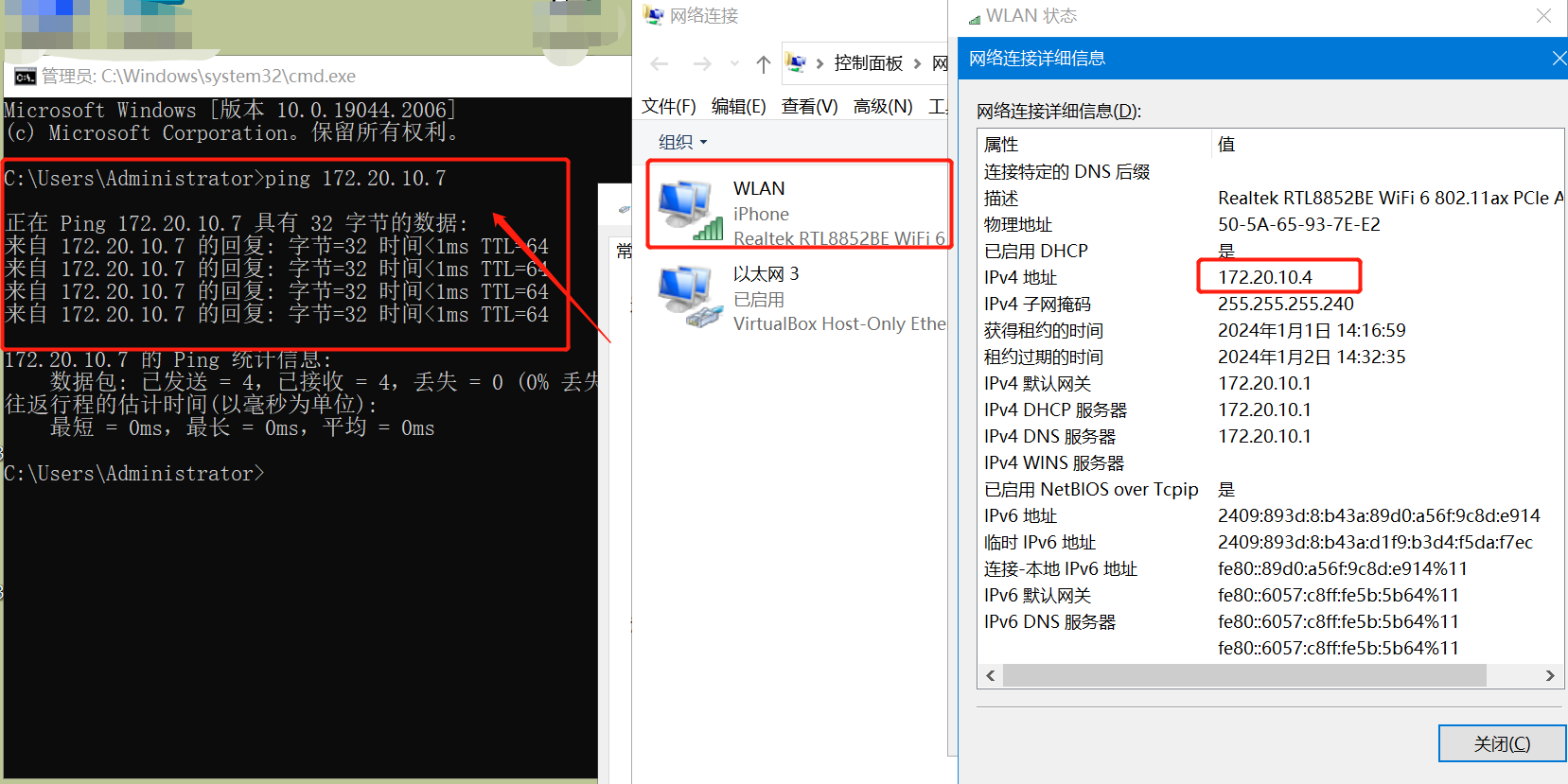 用另一臺PC2無線連接上級AP,可以看到PC2的獲取到了172.20.10.4,最終可以實現(xiàn)2臺電腦互相ping通