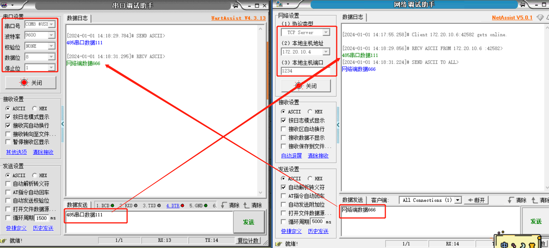 然后打開串口和網(wǎng)絡調(diào)試助手進行數(shù)據(jù)測試