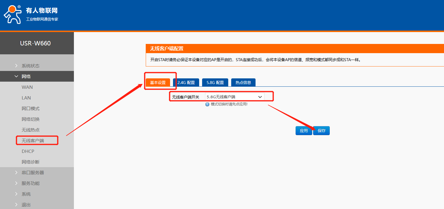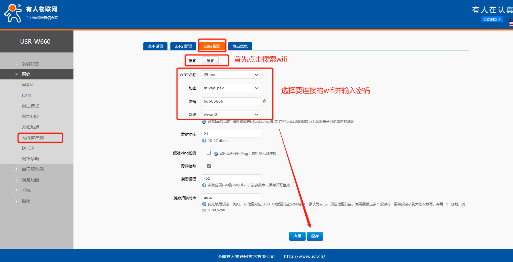 2、配置W660為STA模式--開啟“無線客戶端”,搜索wifi后,選擇要連接的AP的wifi名稱,然后輸入wifi密碼