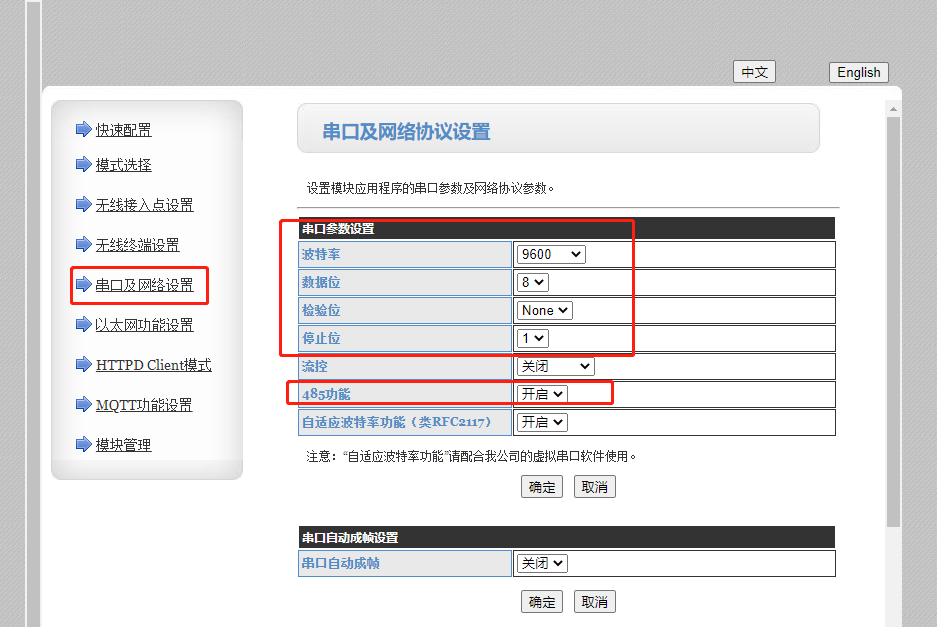波特率57600改為9600,開啟485功能,點(diǎn)擊確定。