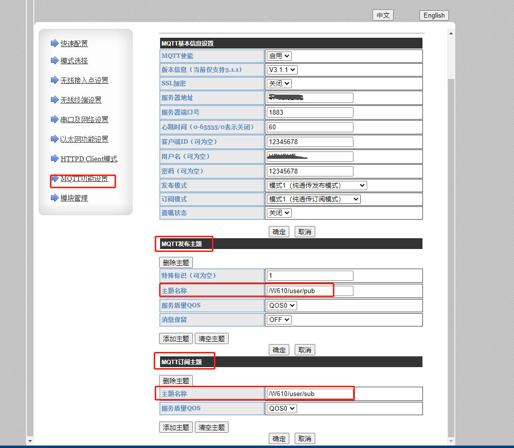 (2)配置MQTT發(fā)布主題和訂閱主題