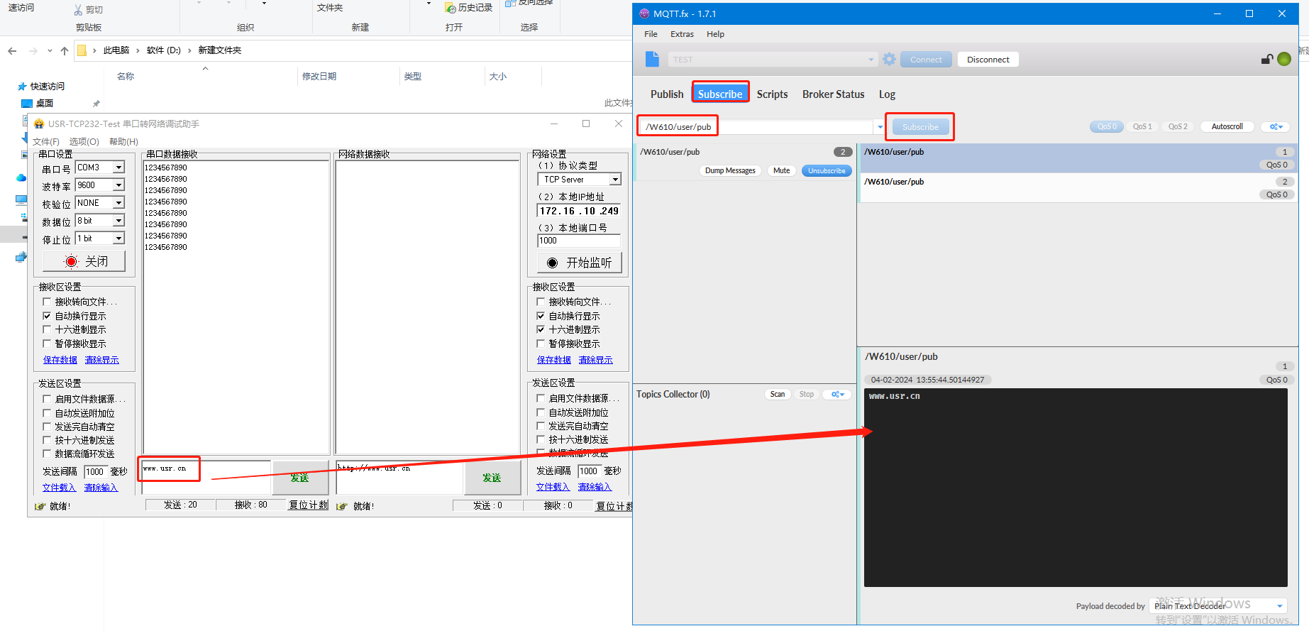 MQTTfx 軟件發(fā)送數(shù)據(jù),W610串口使用串口助手,9600波特率,打開USB-RS485串口線COM口,COM3,可以接收到數(shù)據(jù)。