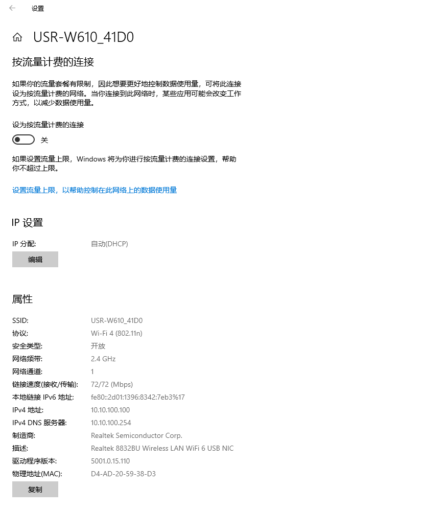 USR-W610默認(rèn)是AP模式,電腦連接USR-W610的wifi。