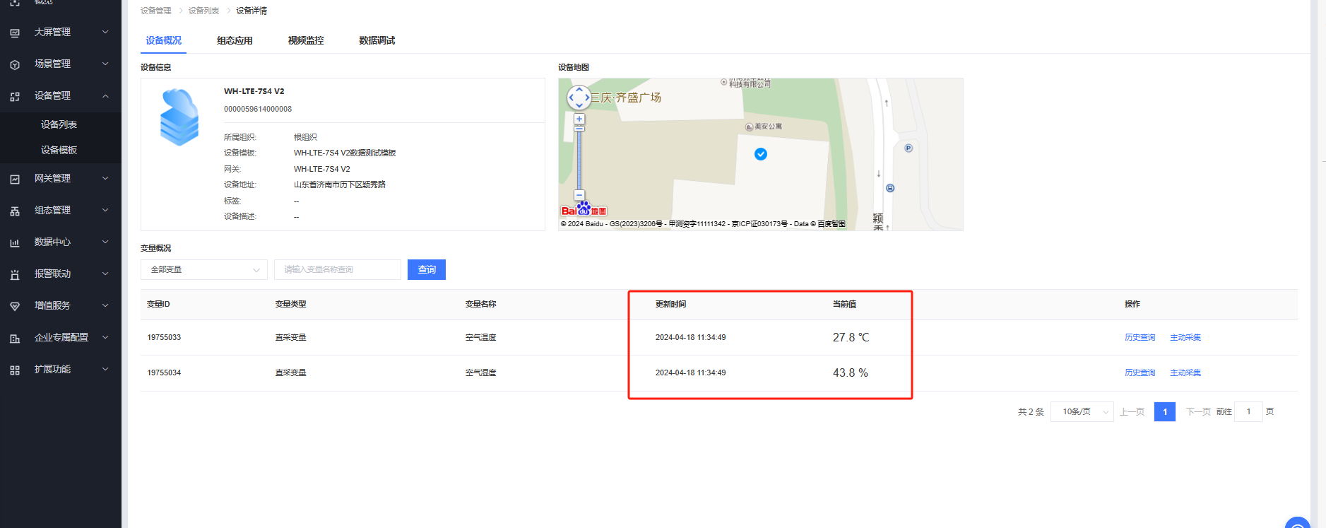 可以看到有人云平臺上看到溫度27.8℃,濕度43.8%。