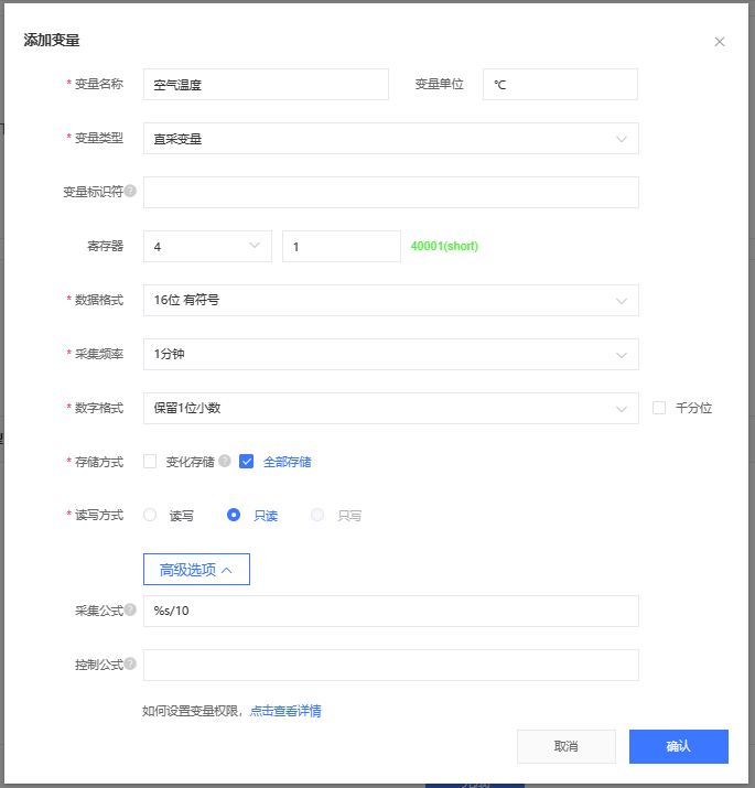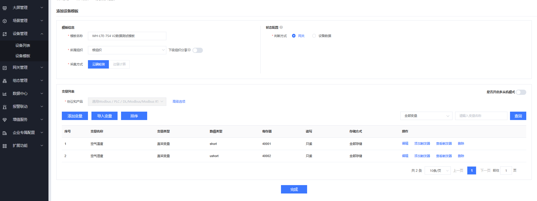 同樣方式添加第二個(gè)變量空氣濕度,寄存器為40002,數(shù)據(jù)類型16位無符號,其他參數(shù)同空氣溫度參數(shù)。點(diǎn)擊完成。
