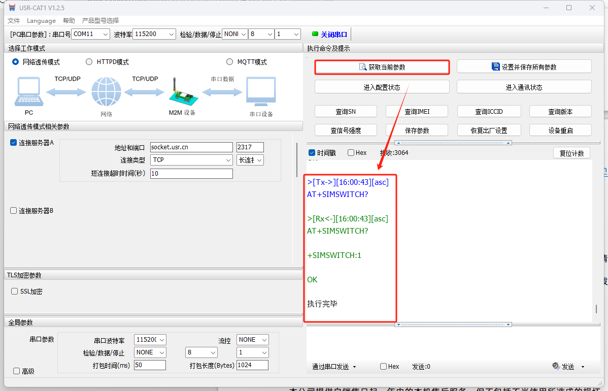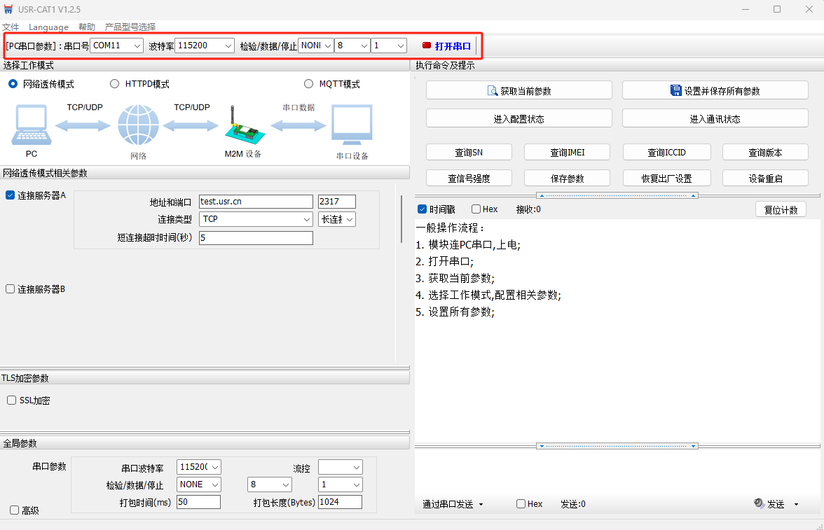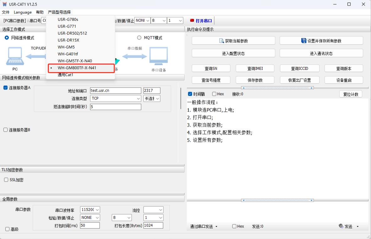 打開(kāi)WH-LTE-7S0上位機(jī)軟件,產(chǎn)品型號(hào)選擇WH-GM800TF-X-N41(同7S0類似),COM11,串口參數(shù)選擇115200 NONE 8 1,打開(kāi)串口