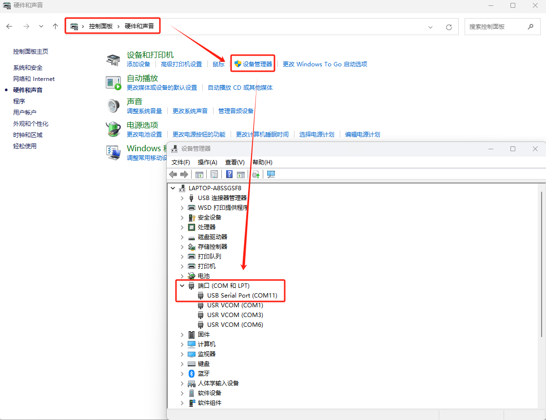 打開(kāi)電腦控制面板---硬件和聲音---設(shè)備管理器---COM和LPT,確認(rèn)下USB轉(zhuǎn)換器的COM口,圖示COM11。