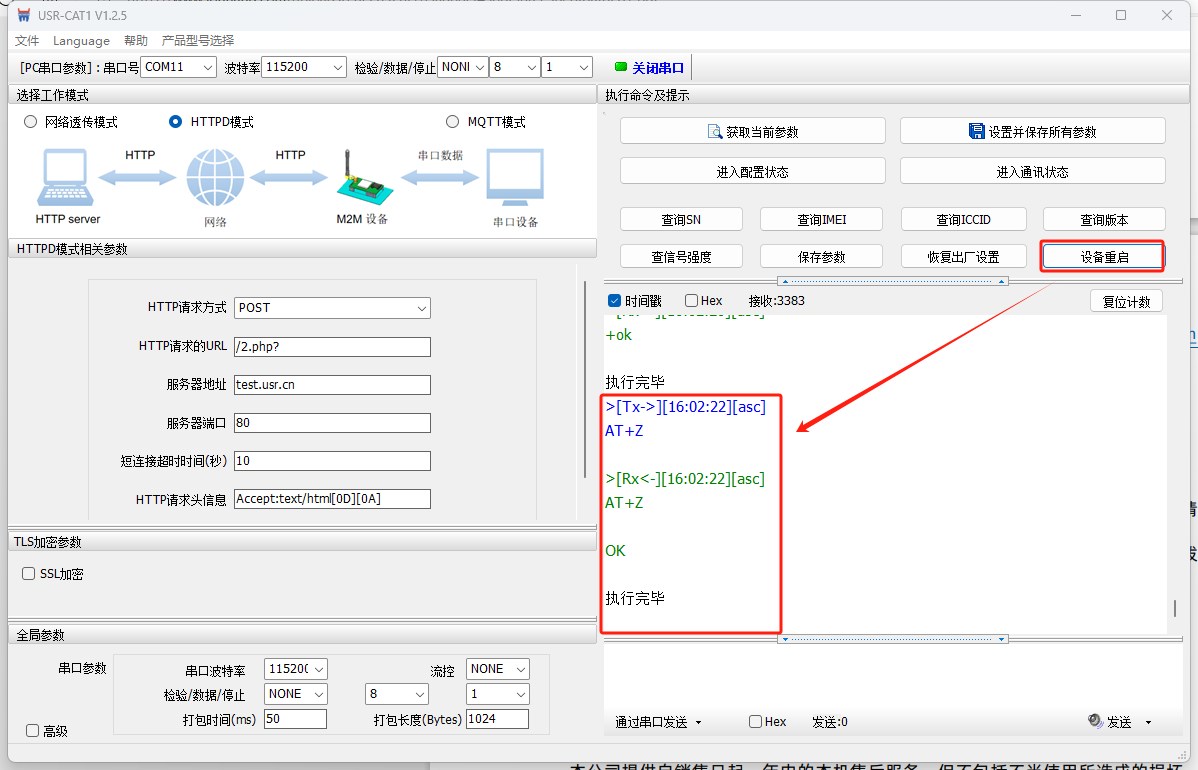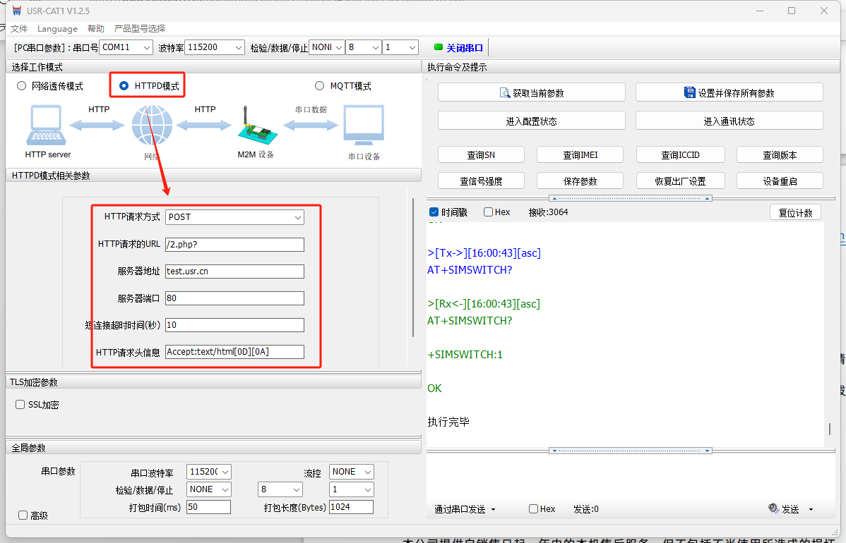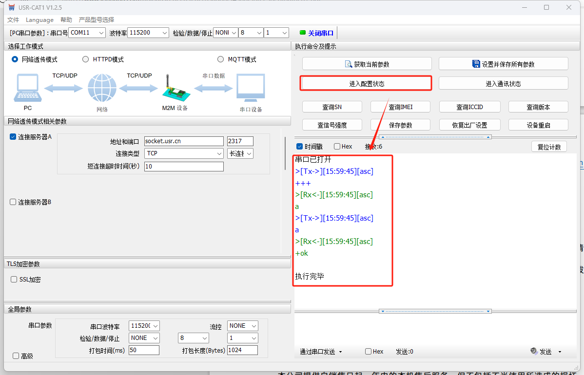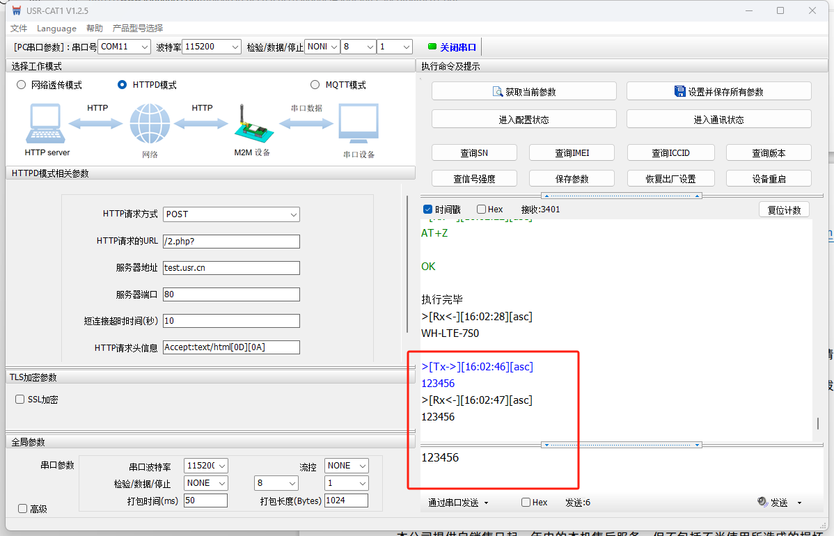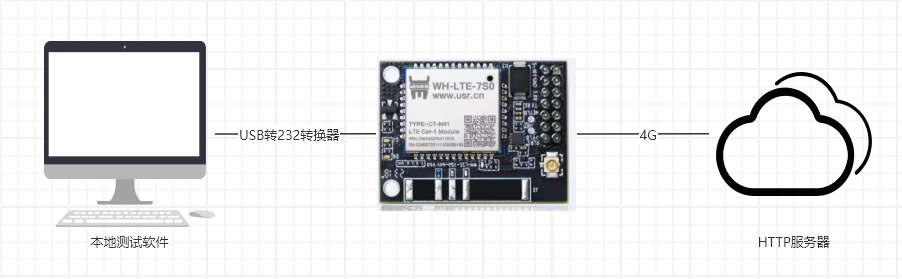 WH-LTE-7S0底板的232串口接USB-RS232串口線到電腦USB口,然后產(chǎn)品接12V電源適配器上電。本例使用有人測(cè)試服務(wù)器,給測(cè)試服務(wù)器發(fā)什么數(shù)據(jù),測(cè)試服務(wù)器回復(fù)什么數(shù)據(jù)。