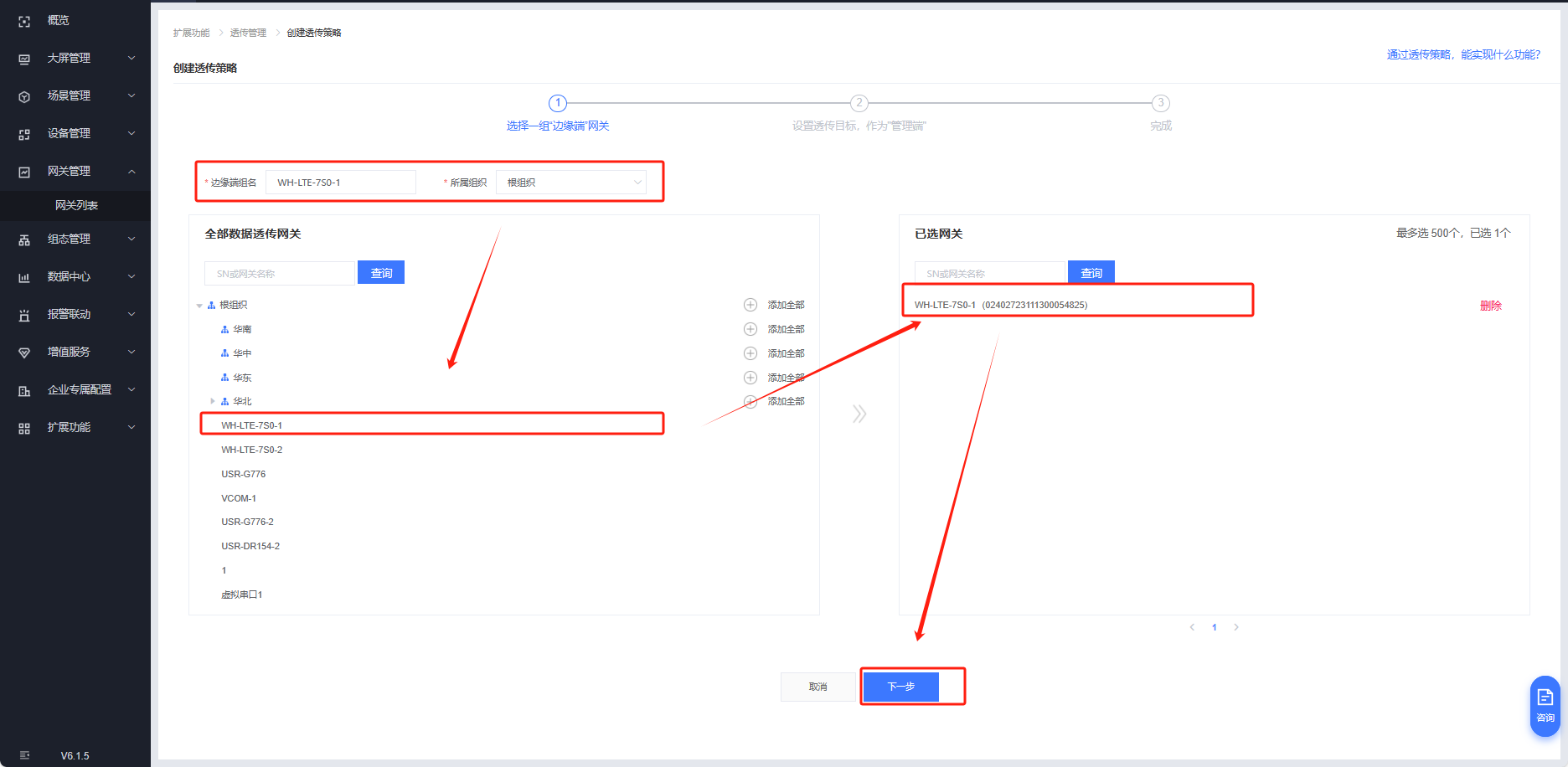 邊緣端命名WH-LTE-7S0-1透傳測試,選擇根組織,選中WH-LTE-7S0-1,下一步