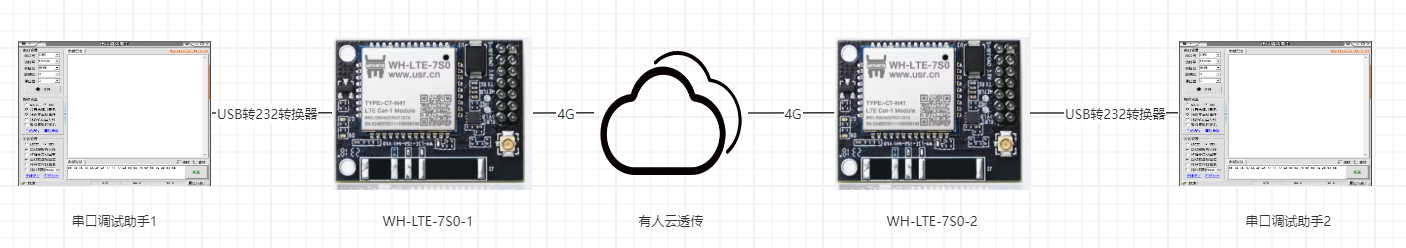 WH-LTE-7S0插入到WH-LTE-7S0-EVK上,WH-LTE-7S0-EVK插入到USR-7SX-EVK底板上,底板的的232串口接USB-RS232串口線到電腦USB口,然后產(chǎn)品底板接12V電源適配器上線。本例使用虛擬串口來模擬多個TCP 設(shè)備,實現(xiàn)WH-LTE-7S0 和多個設(shè)備之間的數(shù)據(jù)透傳