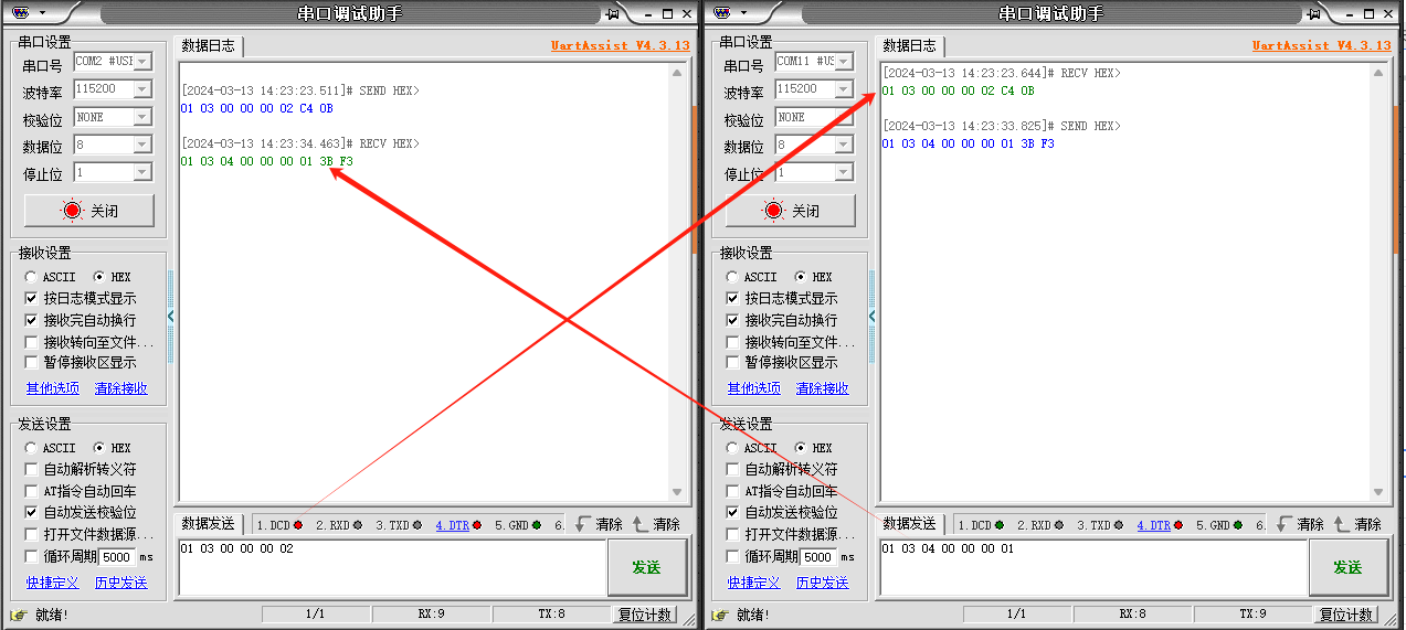 打開兩個串口調(diào)試助手,引用兩個WH-LTE-7S0的串口,進行數(shù)據(jù)互發(fā)測試。