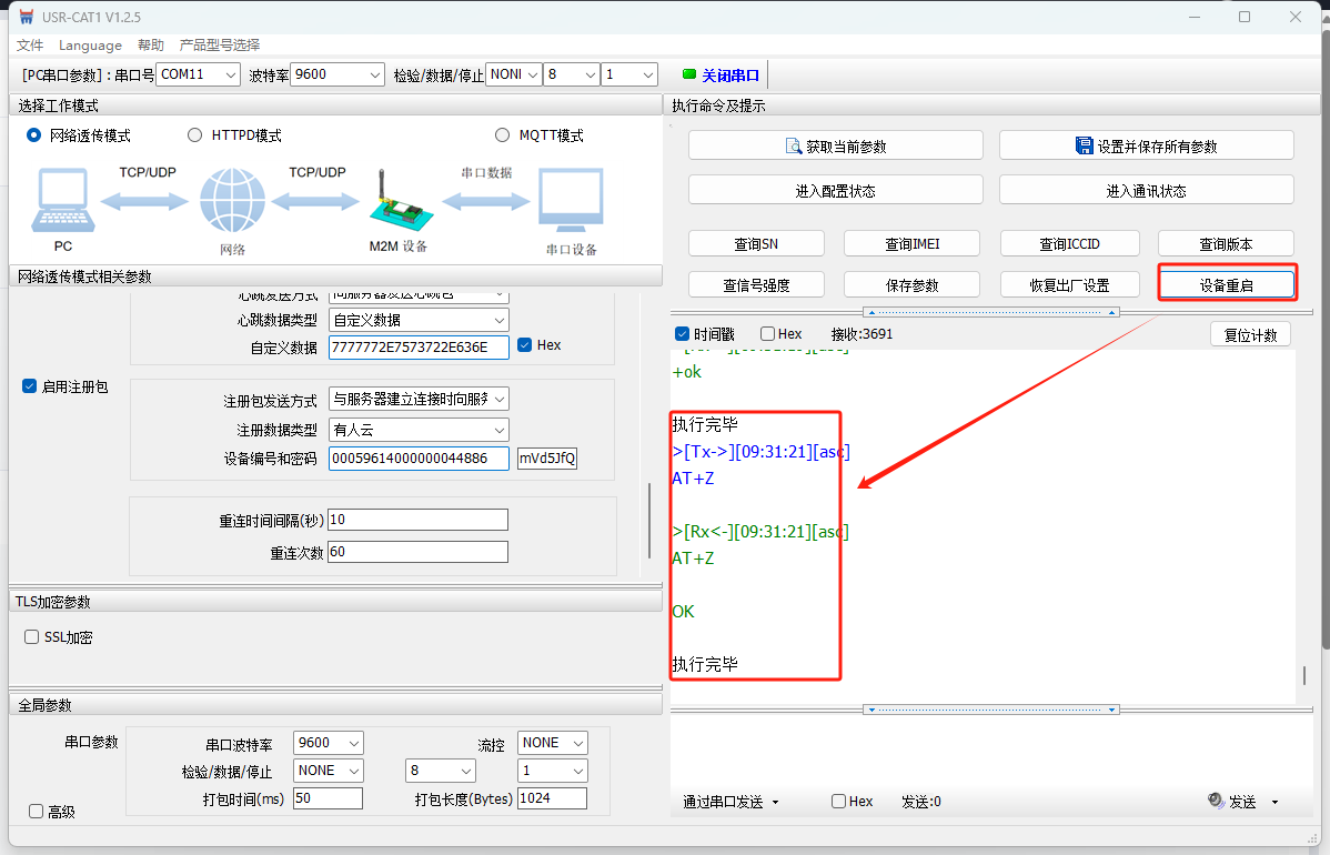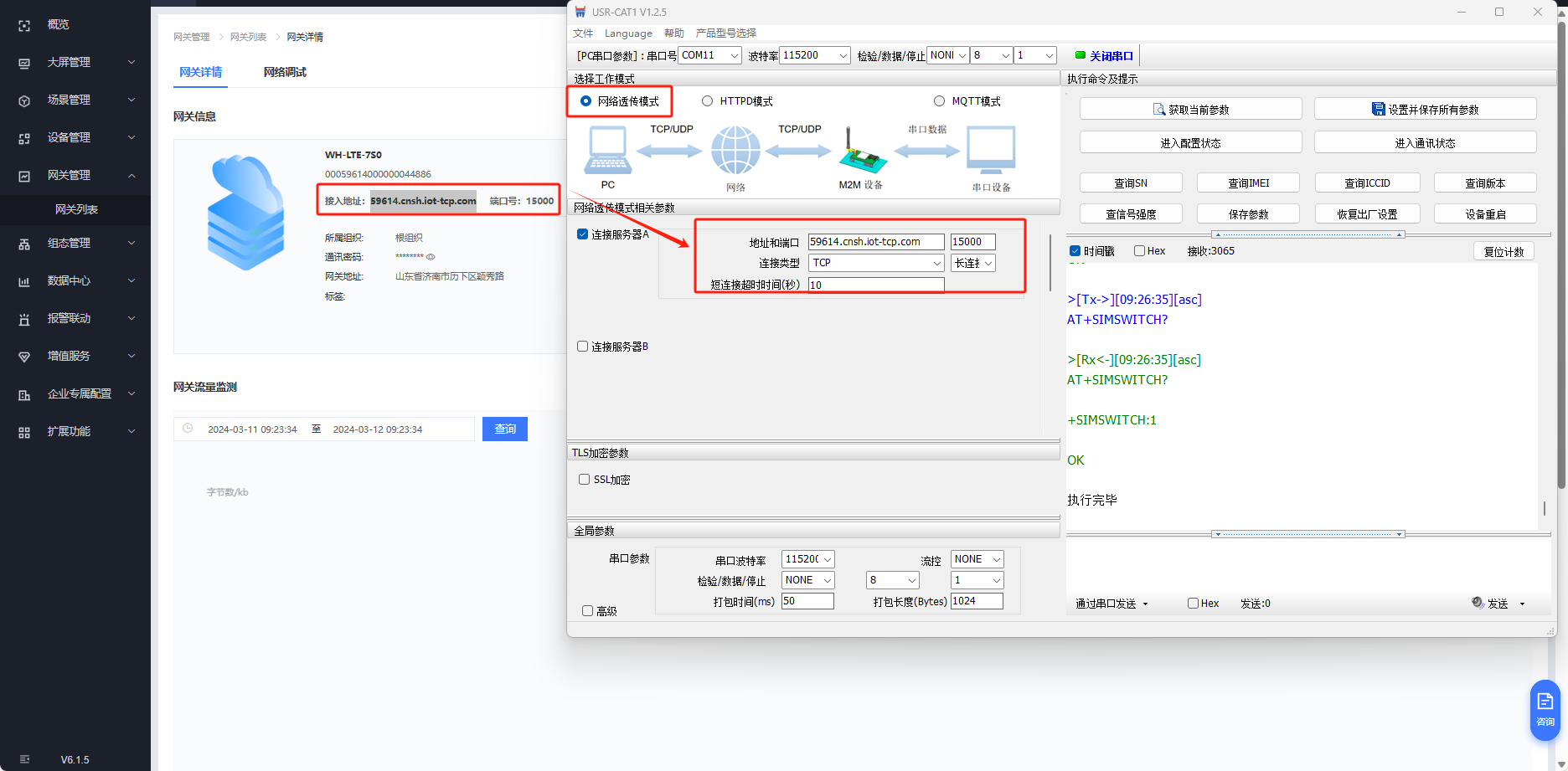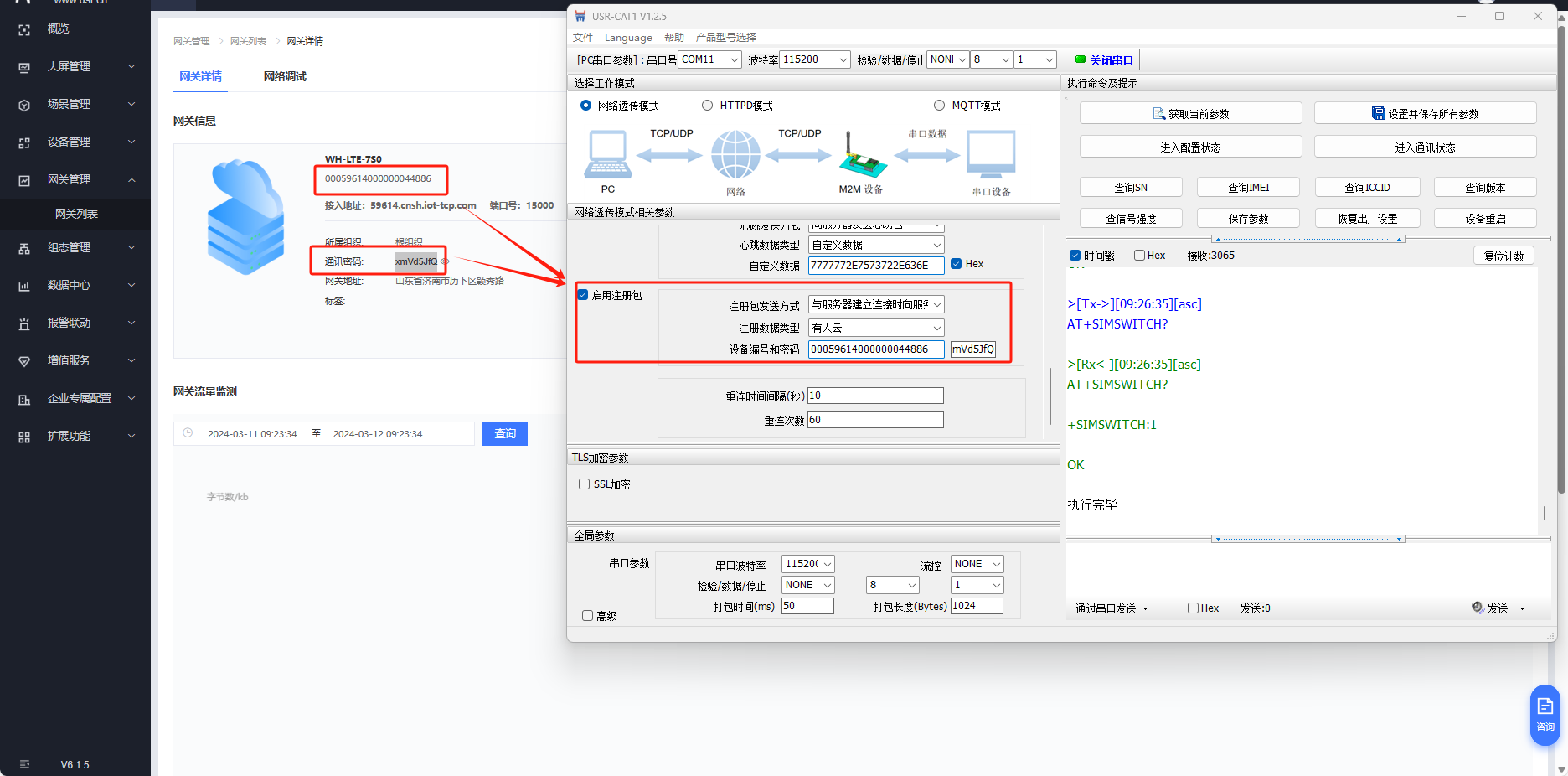 WH-LTE-7S0底板的232串口接USB-RS232串口線到電腦USB口,然后產(chǎn)品接12V電源適配器上線。
