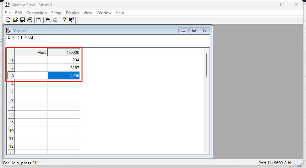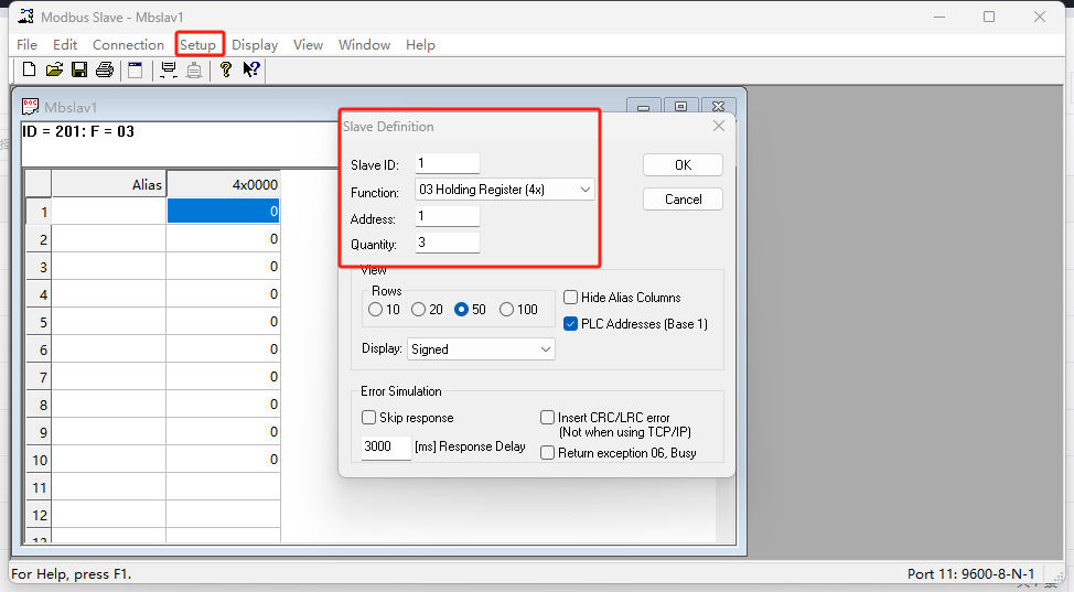 打開Modbus Slave 軟件,選擇COM11,填入WH-LTE-7S0的參數(shù) 9600 none 8 1,點(diǎn)擊OK