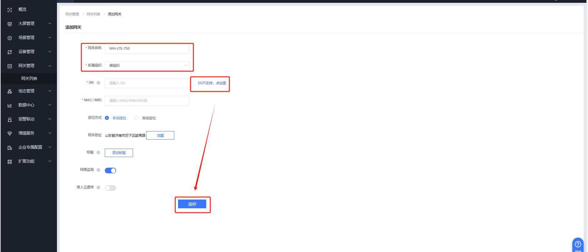 填入網(wǎng)關(guān)名稱---選擇根組織,選擇“SN不支持,點(diǎn)這里” 點(diǎn)擊保存。