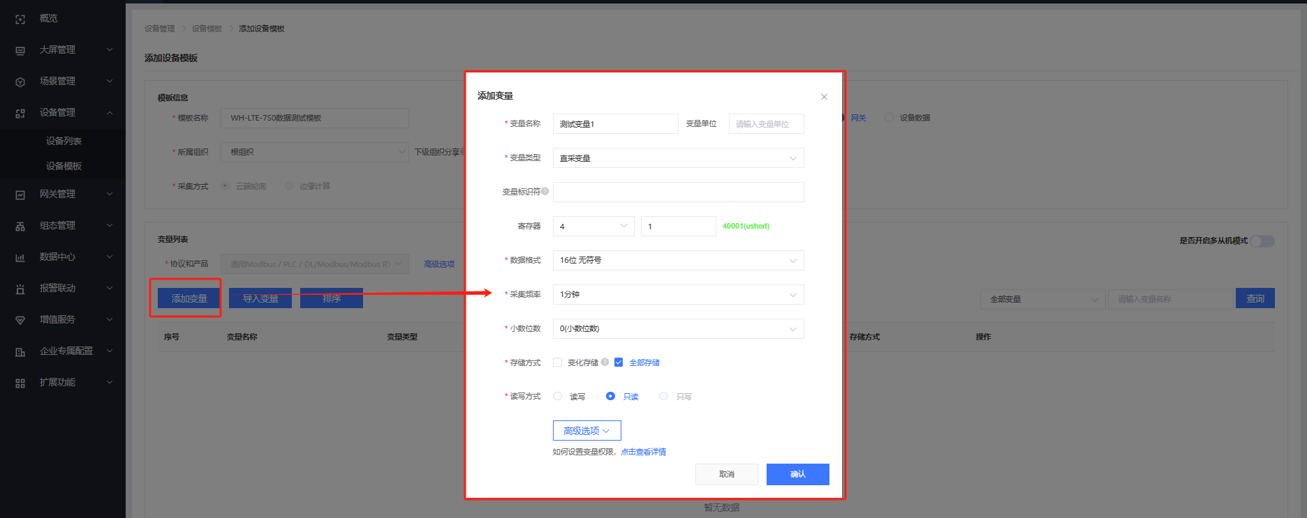 填入模板名稱,選擇根組織,采集方式選擇云端輪詢,協(xié)議選擇通用Modbus/PLC/DL / Modbus / Modbus RTU,點(diǎn)擊添加變量