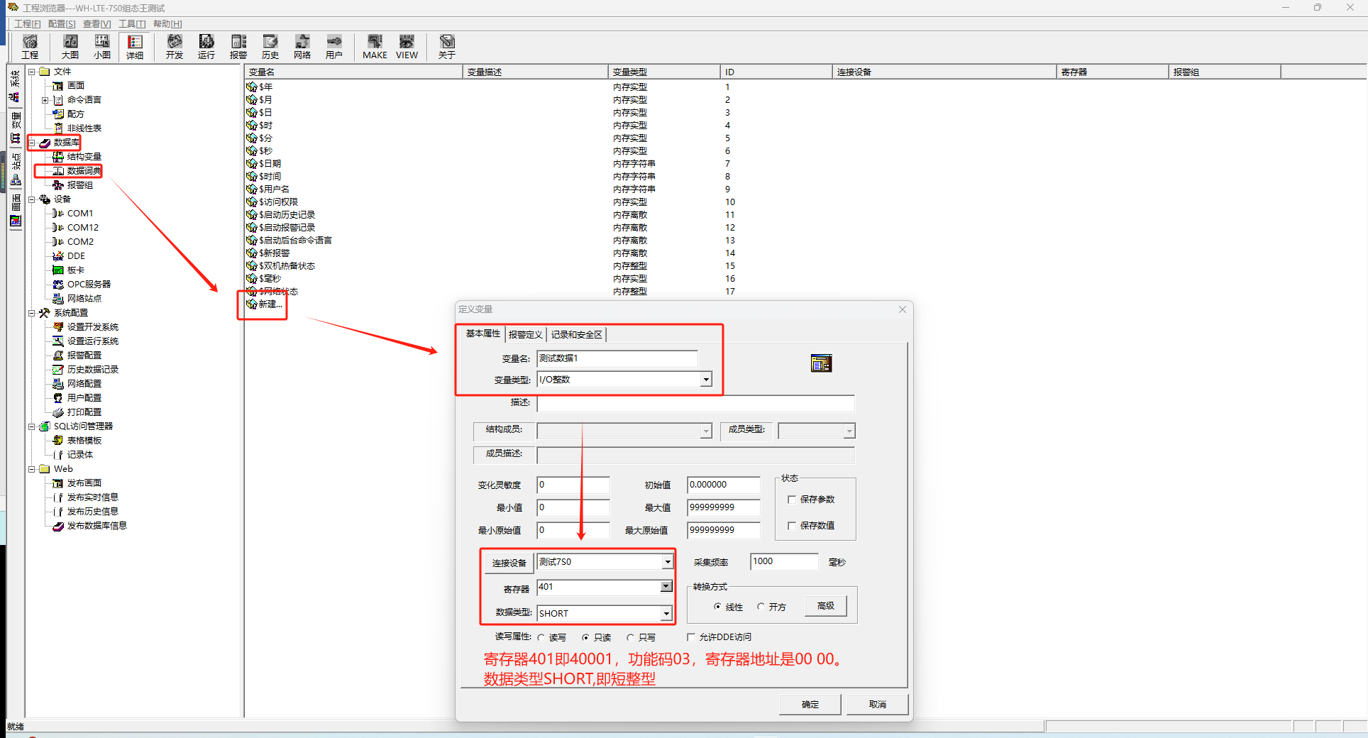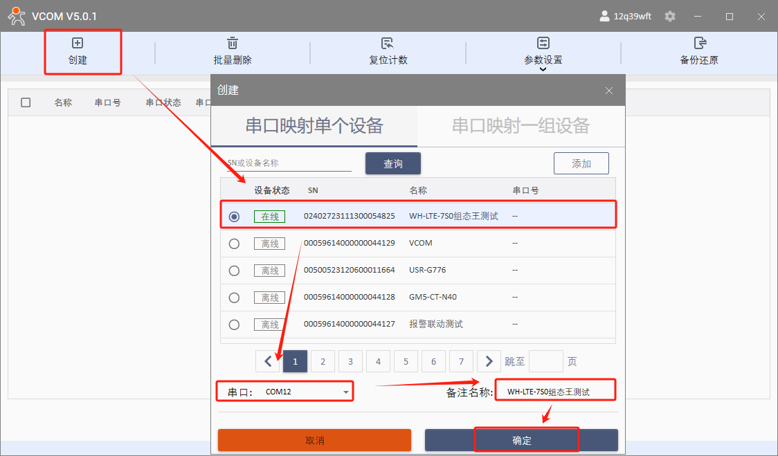 創(chuàng)建---選擇設(shè)備WH-LTE-7S0---選擇串口號(hào)COM12---備注名稱為WH-LTE-7S0組態(tài)王測試---確定