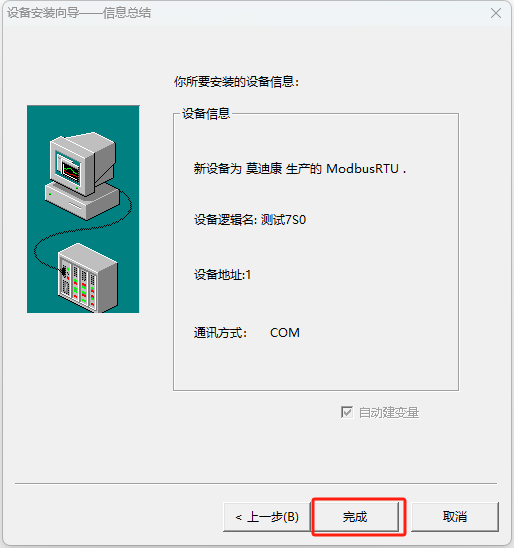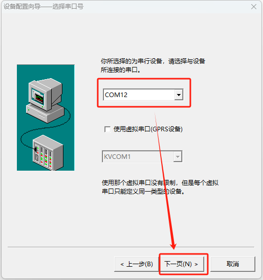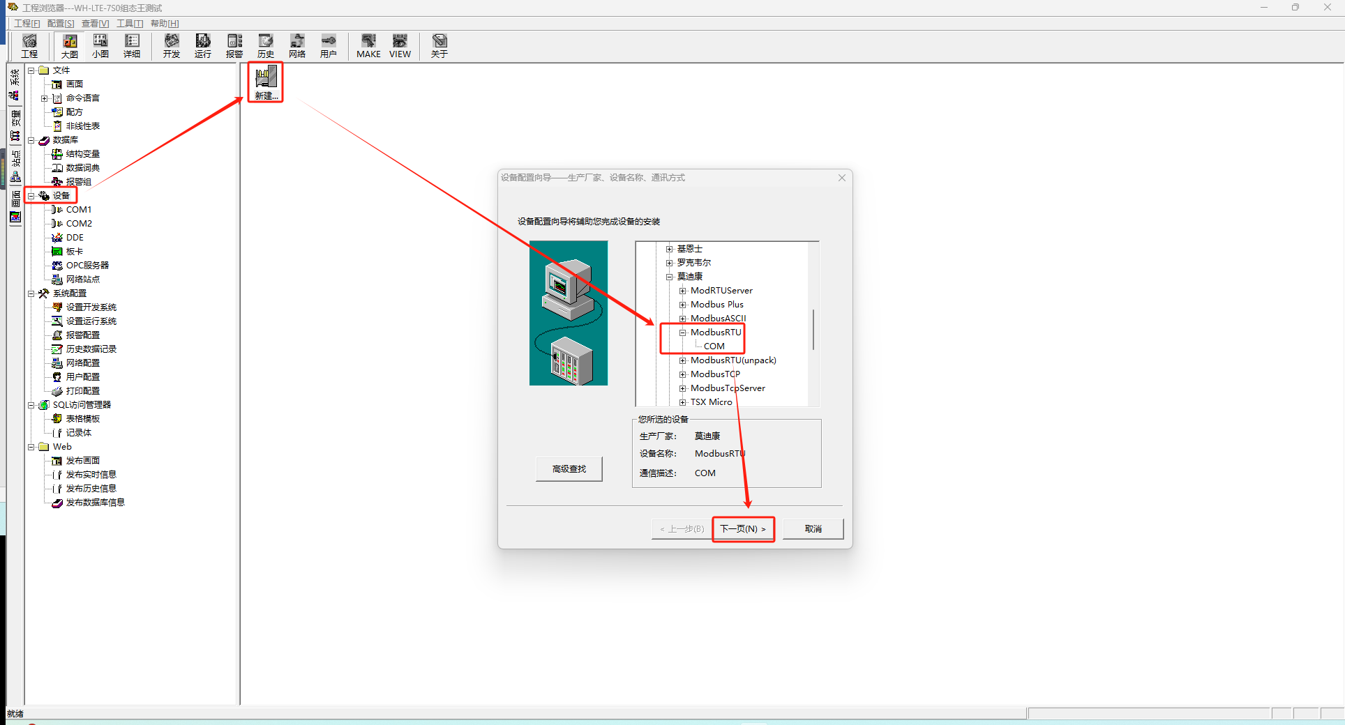 雙擊工程進(jìn)入配置頁面:設(shè)備---新建---PLC---莫迪康---modbus rtu---COM---下一頁