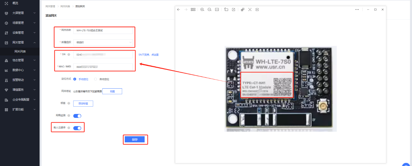 填入設(shè)備名稱,選擇根組織,填入WH-LTE-7S0絲印上的SN和IMEI,開啟有人云透傳,點(diǎn)擊保存。