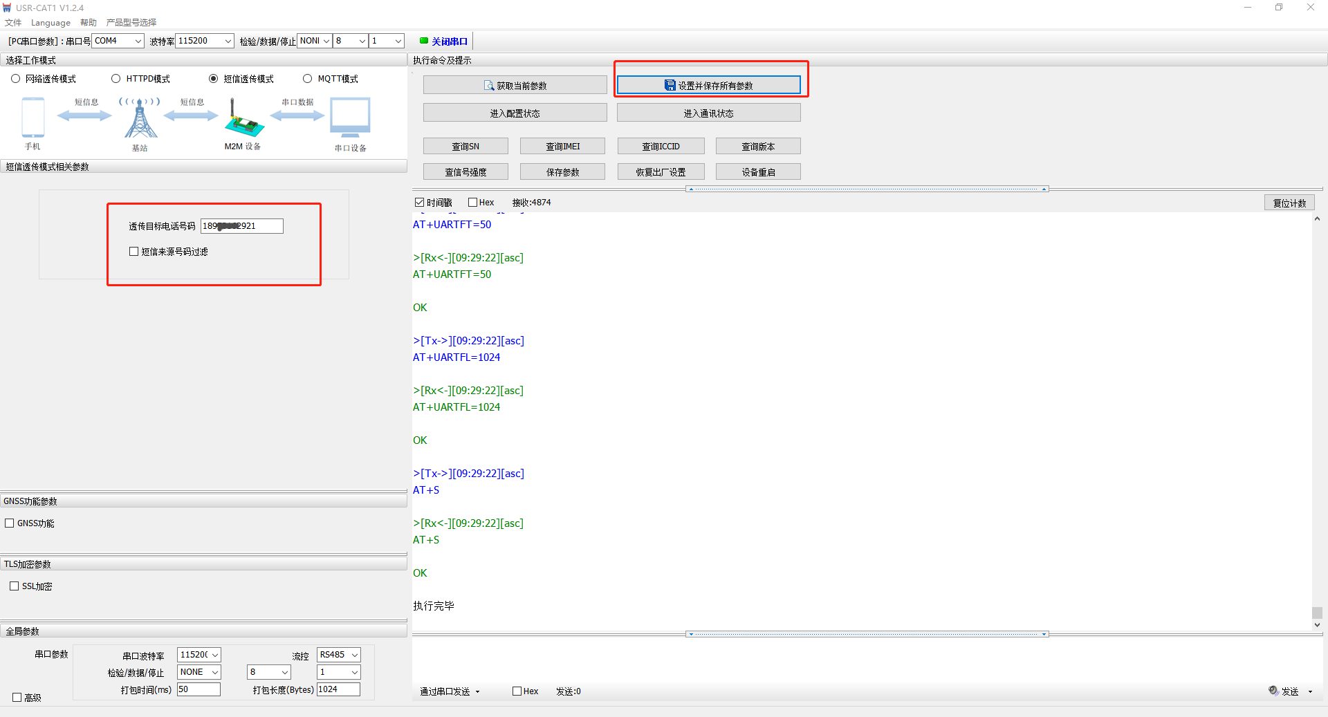 4、選擇短信透傳模式,透傳目標電話號碼輸入另一個可以正常接收短信的手機號碼,點擊設(shè)置并保存所有參數(shù),然后再關(guān)閉串口。