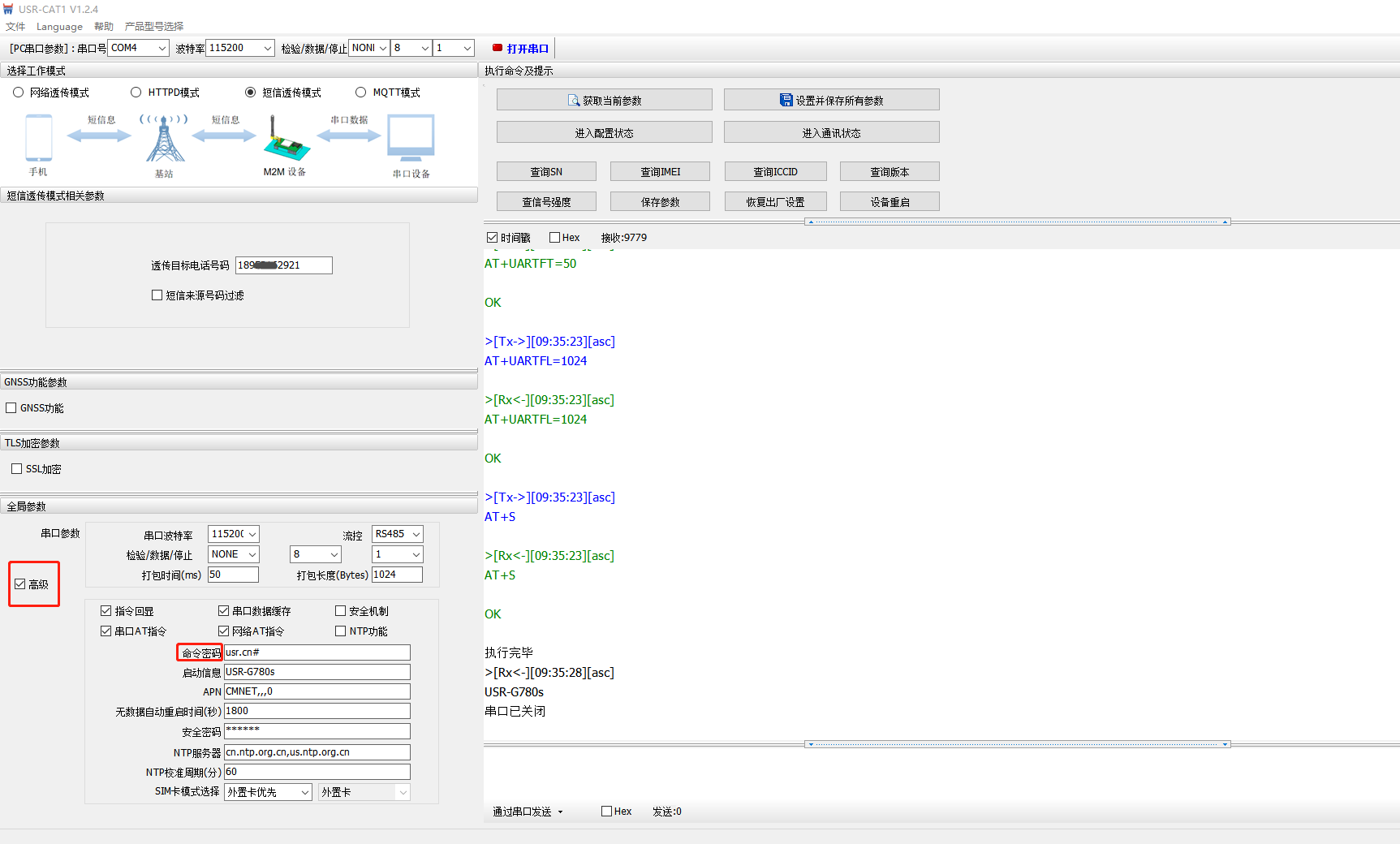 命令密碼默認是usr.cn#,USR-G780s用設(shè)置軟件讀取參數(shù),勾選高級,可以從高級內(nèi)容中,查詢或修改命令密碼。