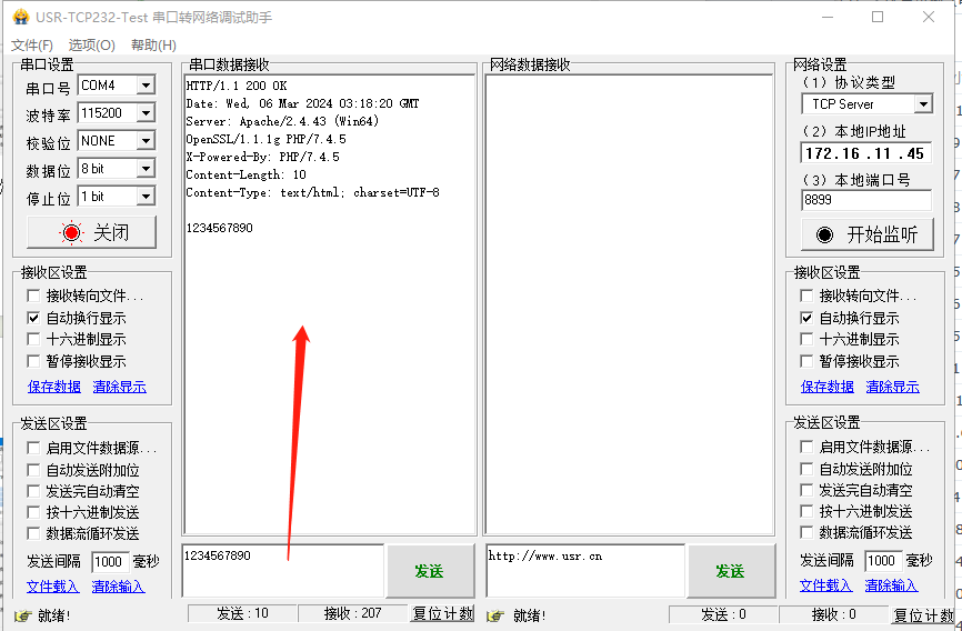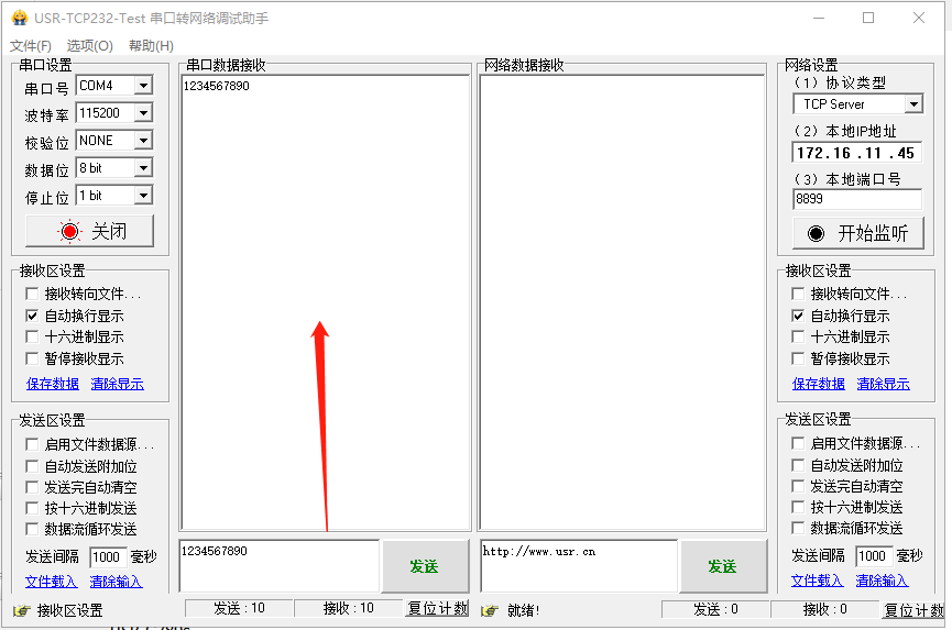 打開串口助手,串口參數(shù)和USR-G780s串口參數(shù)設(shè)置一致,發(fā)送1234567890給有人公司的測試服務(wù)器,測試服務(wù)器收到串口發(fā)送的數(shù)據(jù),會將數(shù)據(jù)返回給串口。因為開啟過濾HTTP頭功能,所以返回的信息中,只有數(shù)據(jù)1234567890。