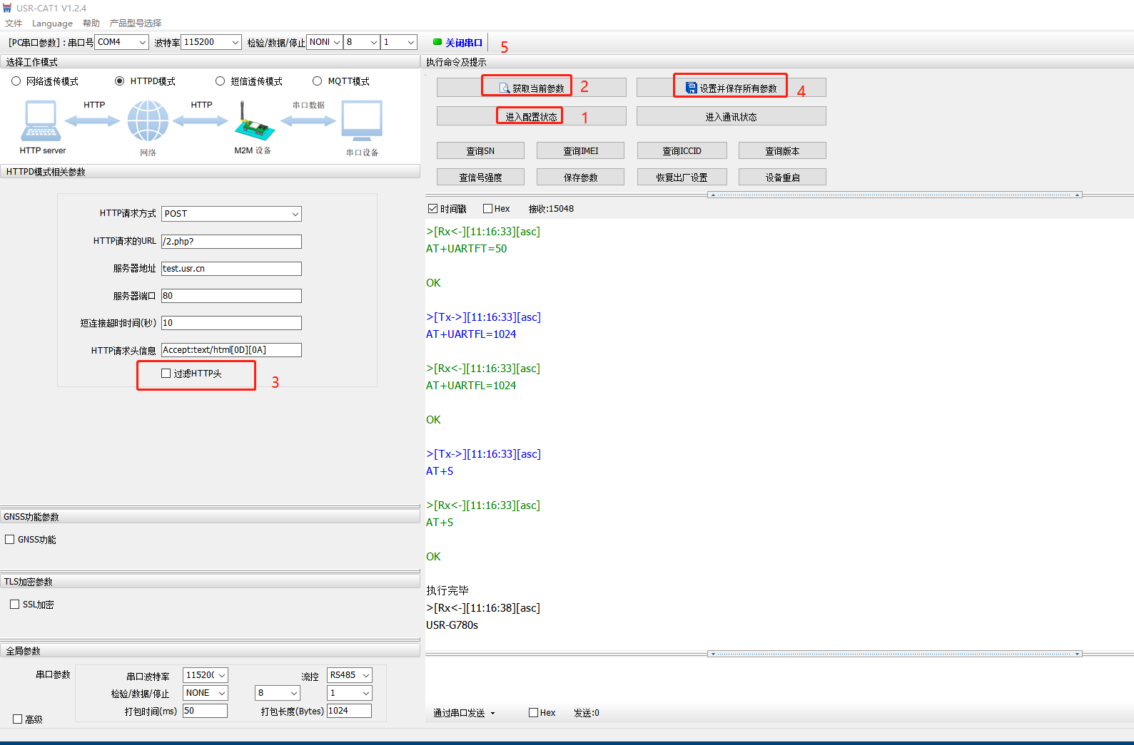 (1)關(guān)閉串口助手,打開USR-G780s的設(shè)置軟件,打開串口,點擊進入配置狀態(tài),點擊獲取當前參數(shù),取消勾選過濾HTTP頭功能,點擊設(shè)置并保存所有參數(shù)。參數(shù)設(shè)置成功之后,設(shè)置軟件關(guān)閉串口。