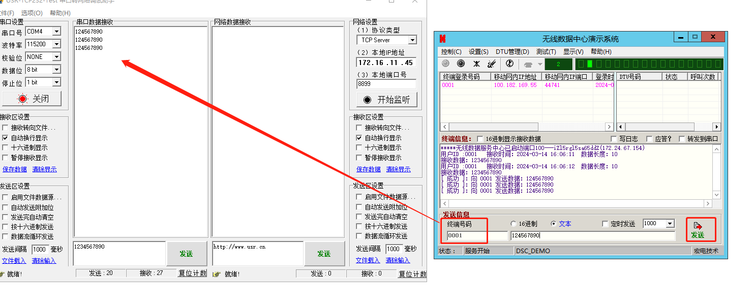 6、無(wú)線(xiàn)數(shù)據(jù)中心演示系統(tǒng)發(fā)送信息區(qū),對(duì)終端號(hào)碼0001,發(fā)送1234567890,USR-G780 V2連接的串口助手,接收到數(shù)據(jù)1234567890。