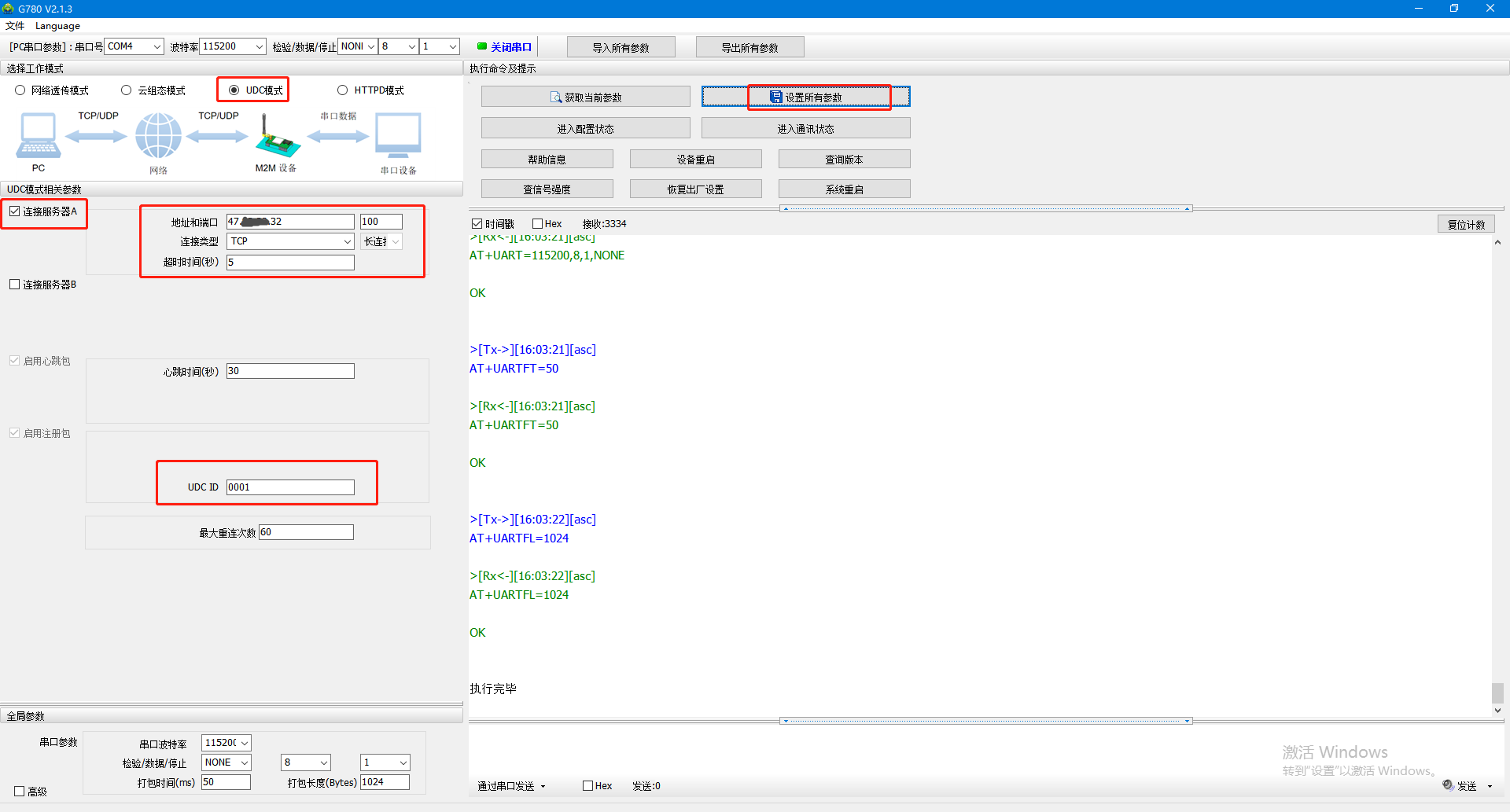 4、選擇UDC模式,勾選連接服務(wù)器A,地址設(shè)置要連接的遠(yuǎn)程服務(wù)器地址,端口100,連接類(lèi)型TCP,長(zhǎng)連接。UDC ID用0001。設(shè)置完參數(shù),點(diǎn)擊設(shè)置所有參數(shù),點(diǎn)擊設(shè)備重啟。