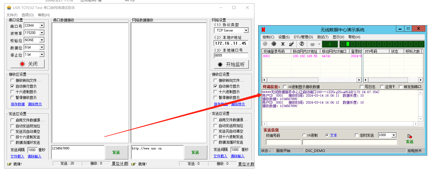 5、 USR-G780 V2接USB-RS232到電腦,電腦打開(kāi)串口助手,打開(kāi)COM口,發(fā)送數(shù)據(jù)1234567890,遠(yuǎn)程服務(wù)器上的無(wú)線(xiàn)數(shù)據(jù)中心演示系統(tǒng)顯示接收信息。