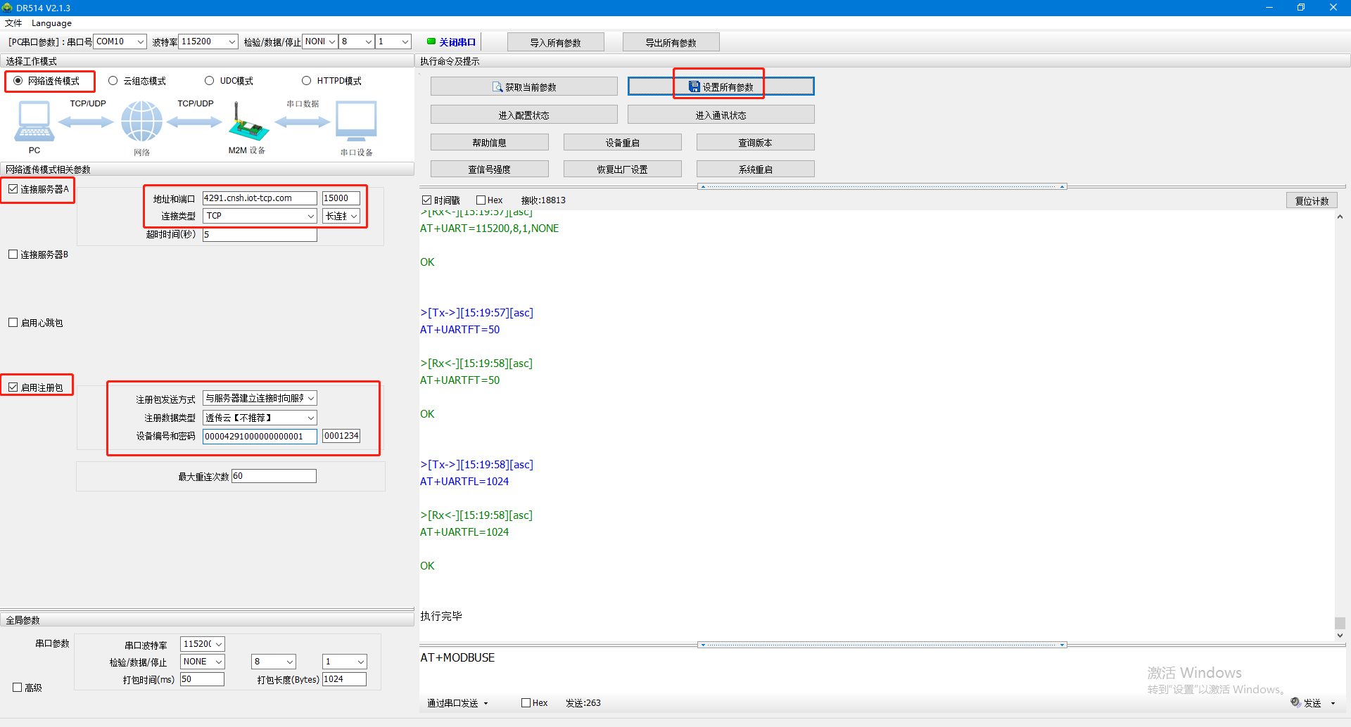 設(shè)置服務(wù)器地址4291.cnsh.iot-tcp.com和端口號(hào)15000,開啟注冊(cè)包,輸入有人云添加設(shè)備的ID00004291000000000001和密碼00001234,點(diǎn)擊設(shè)置所有參數(shù)。