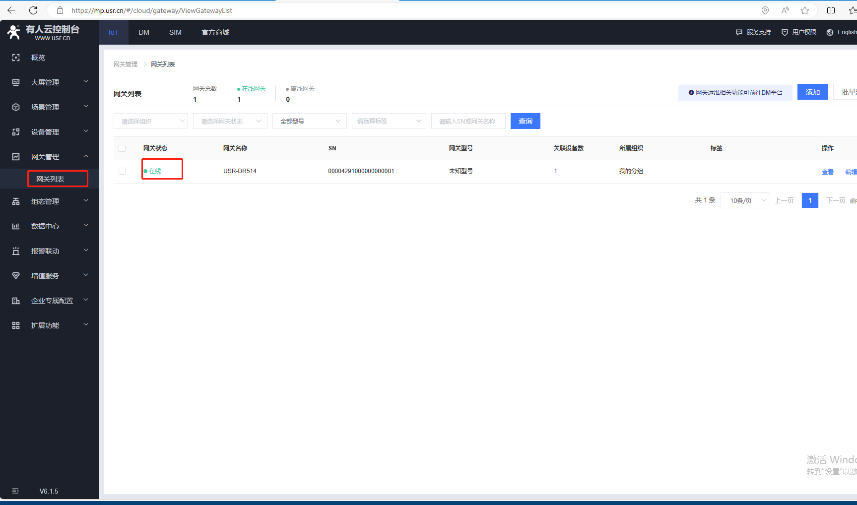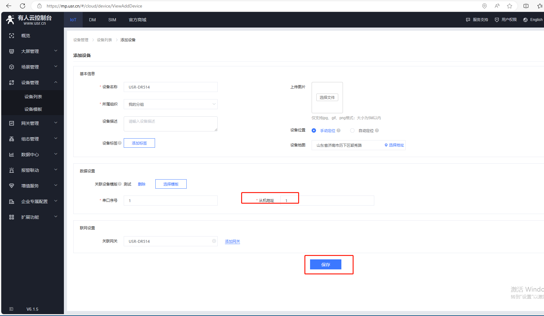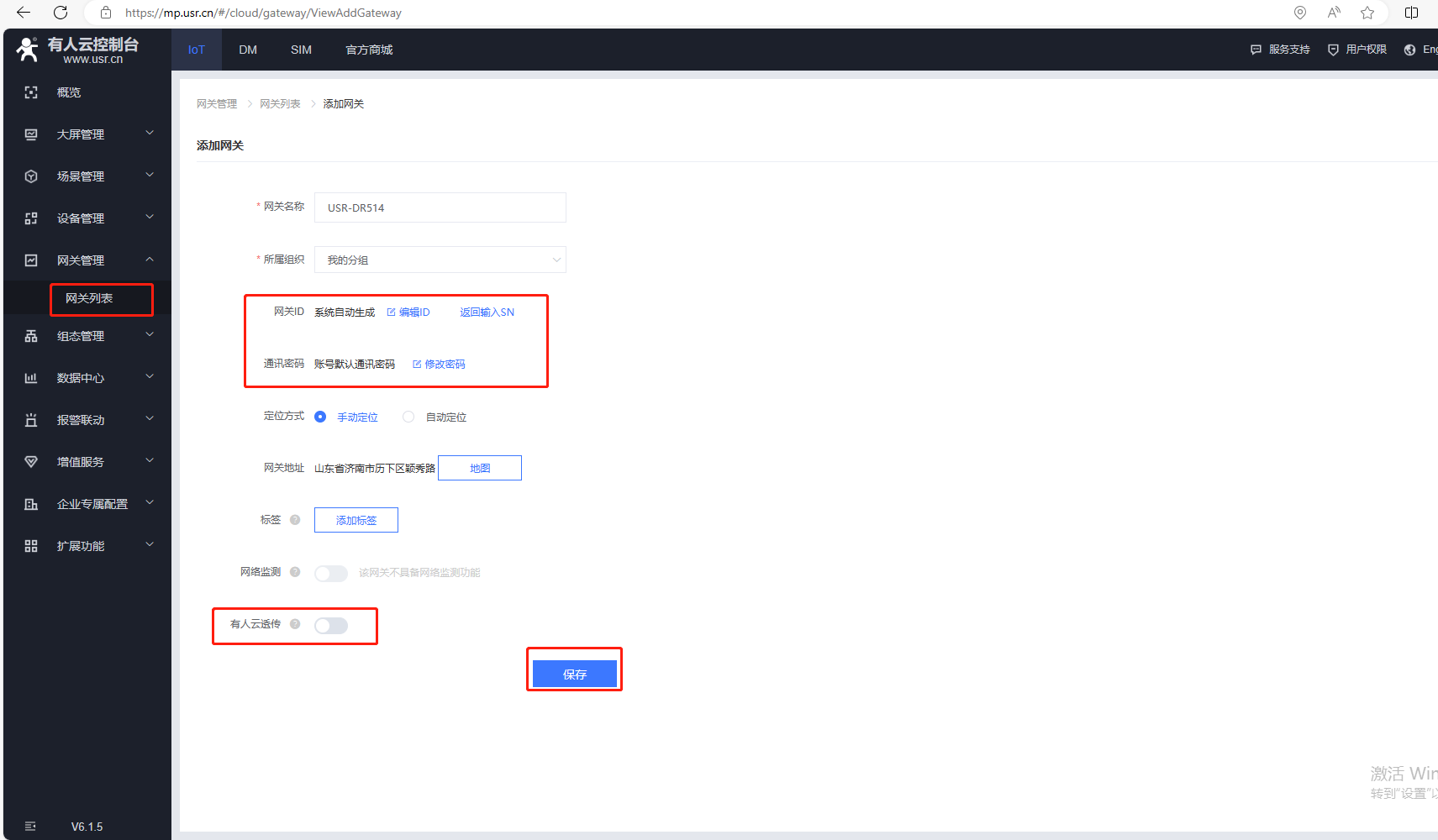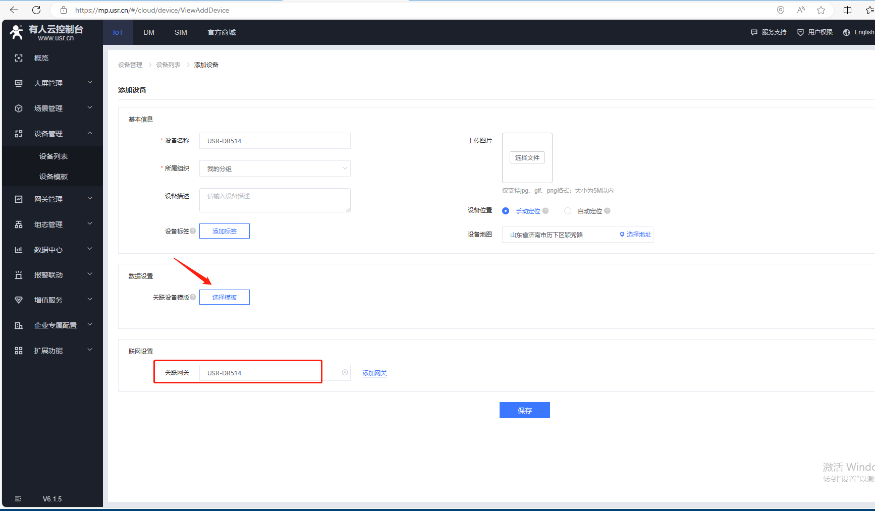 聯(lián)網(wǎng)設(shè)置,關(guān)聯(lián)網(wǎng)關(guān)選擇自身設(shè)備,USR-DR514,最后點(diǎn)擊保存。