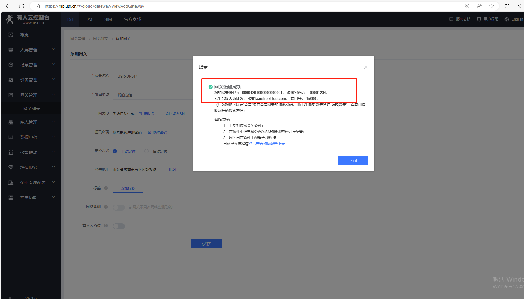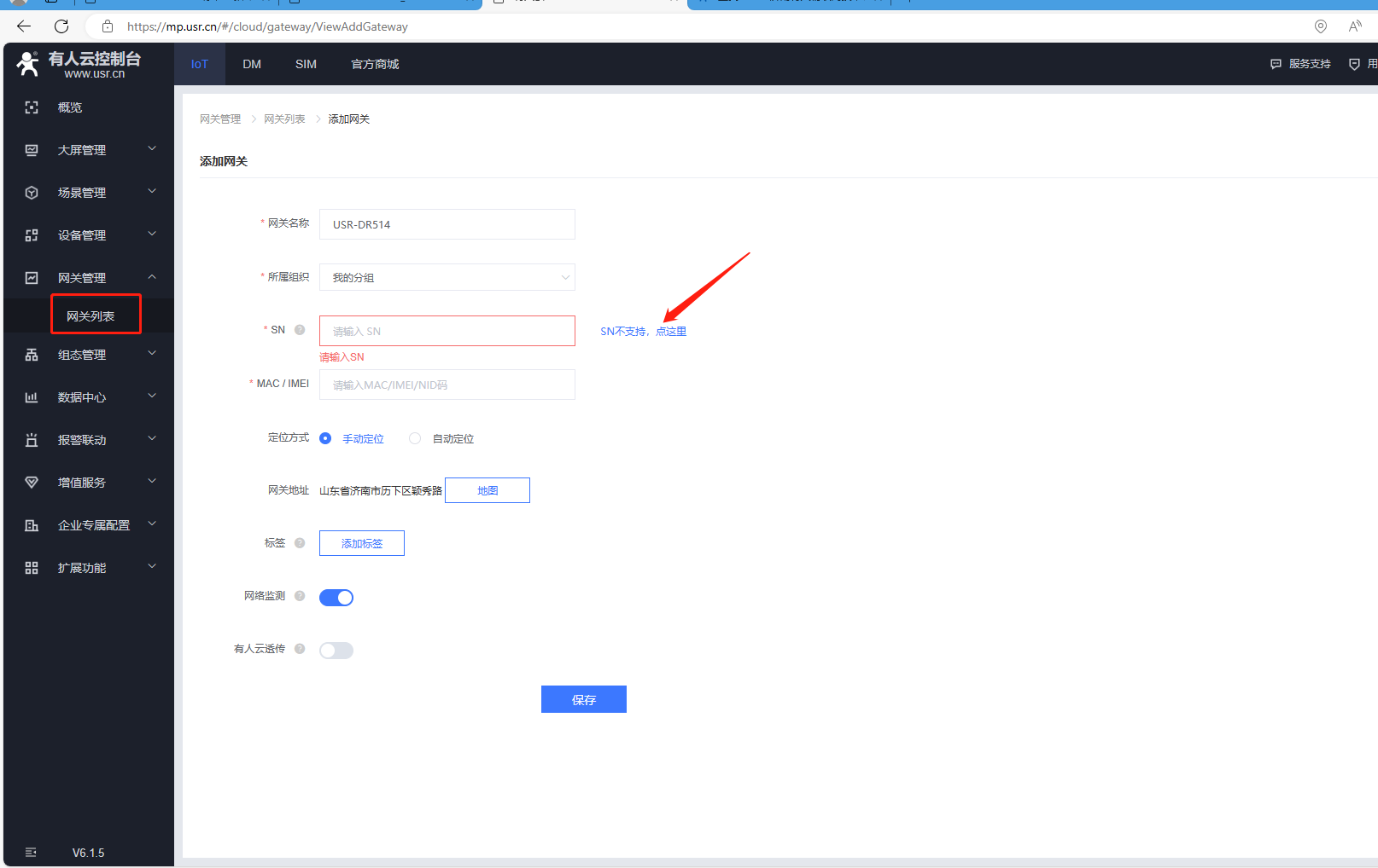 (2)USR-DR514不支持SN上云,就點(diǎn)擊SN不支持,點(diǎn)這里,用自動(dòng)生成的ID方式上云,在有人云上添加設(shè)備,用云端輪詢時(shí)有人云透?jìng)餍枰P(guān)閉,最后點(diǎn)擊保存。
