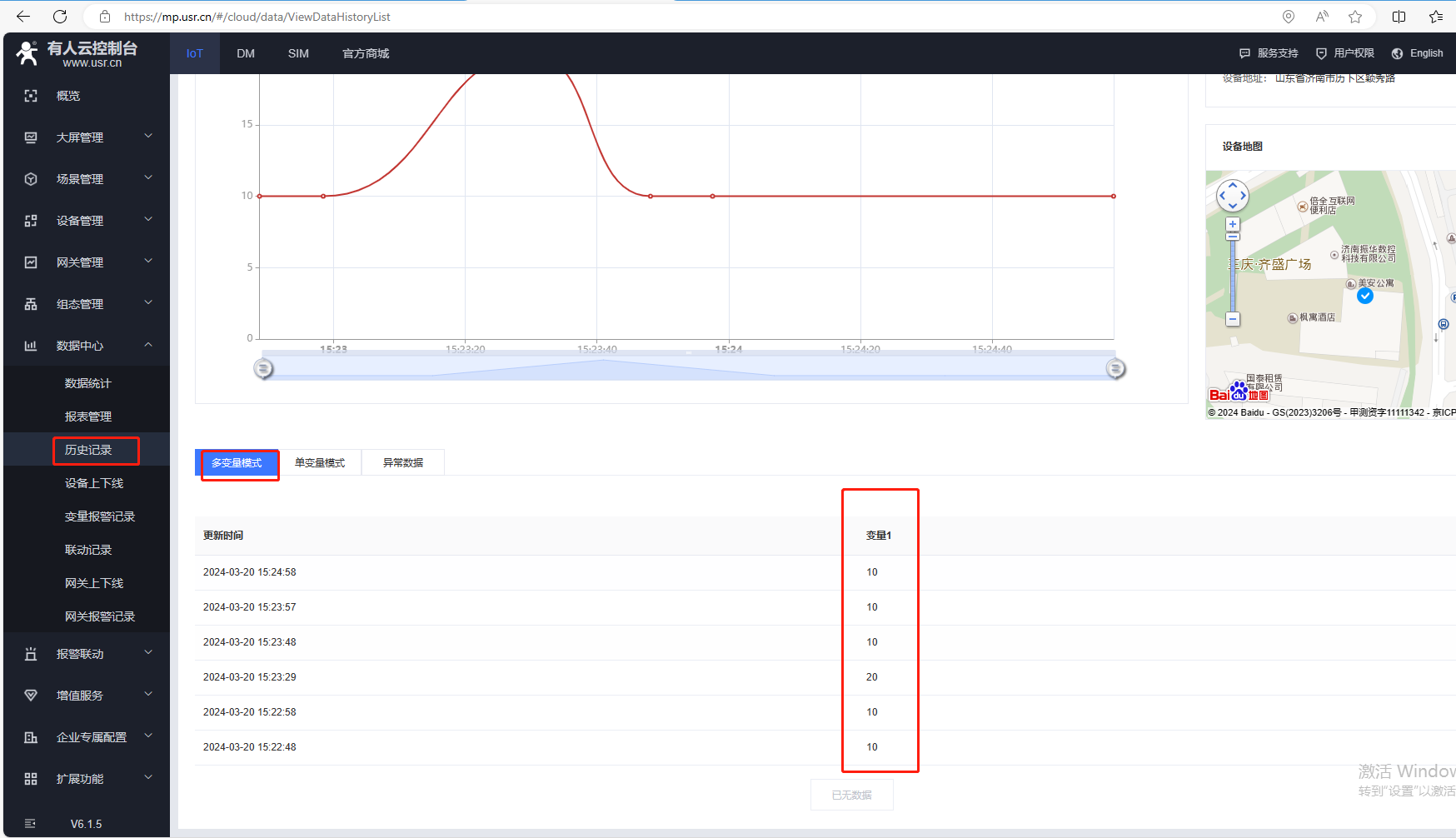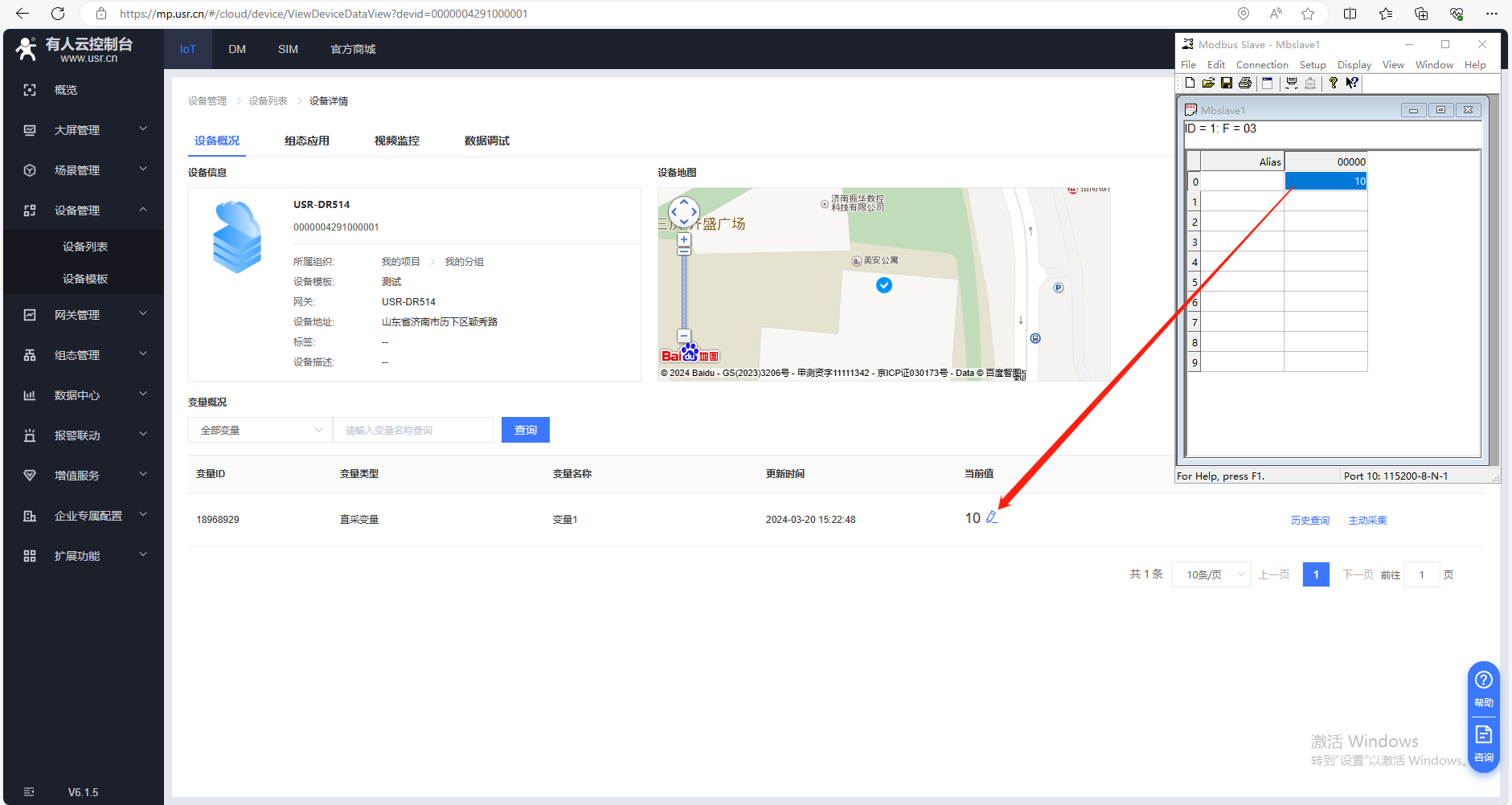 2、MODBUS slave數(shù)據(jù)設(shè)置10,有人云設(shè)備列表1分鐘采集,可以看到變量采集的當(dāng)前值數(shù)據(jù)10。