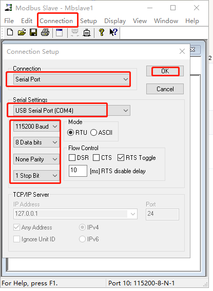(2)點(diǎn)擊Connection,選擇串口,對(duì)應(yīng)USR-DR514所接USB-RS485串口線的COM口號(hào),串口參數(shù)和USR-DR514串口參數(shù)保持一致。 Mode選擇RTU,模擬MODBUS RTU協(xié)議串口。