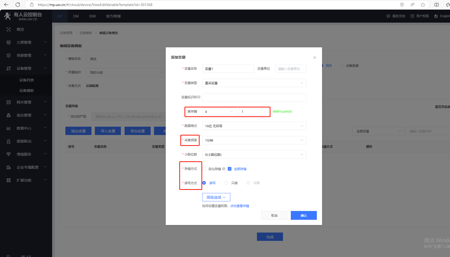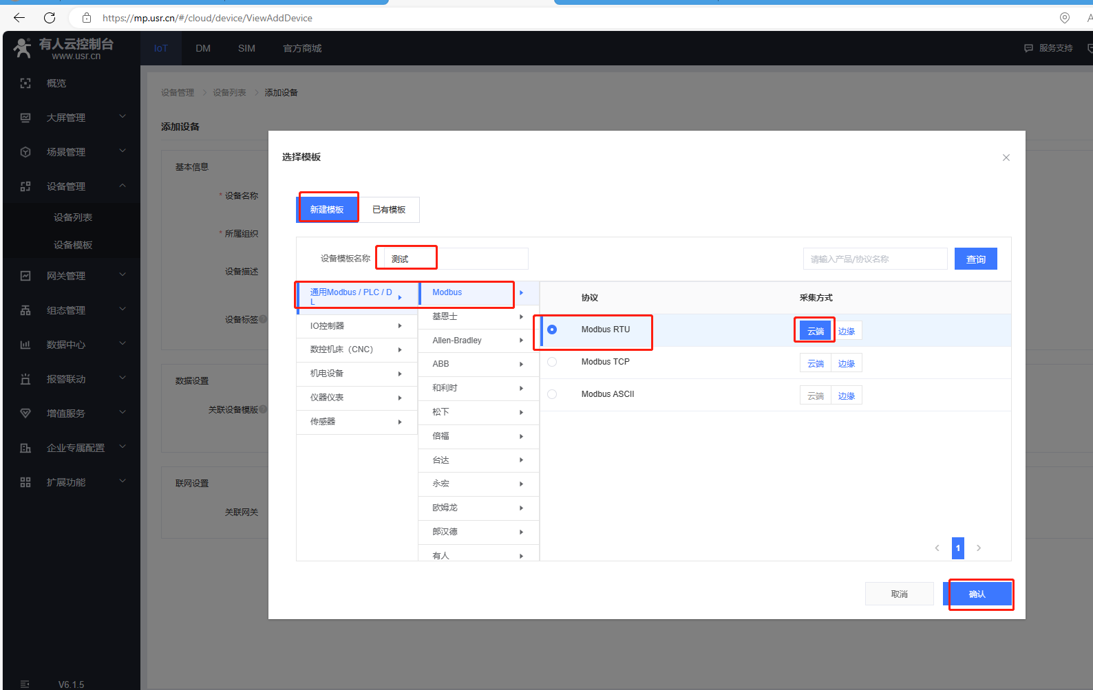 選擇新建模板,輸入設(shè)備模板名稱,通用Modbus/PLC/DL,選擇Modbus,協(xié)議選擇Modbus Rtu,采集方式云端,最后確認(rèn)。
