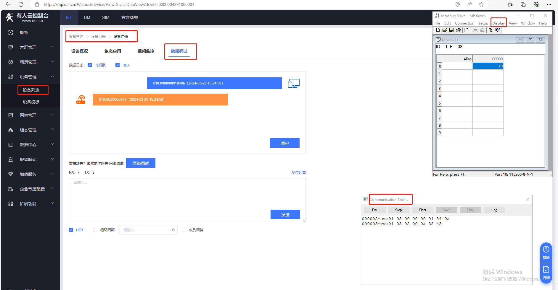 還可以利用有人云的數(shù)據(jù)調(diào)試功能,查看有人云的數(shù)據(jù)收發(fā)是否正常。