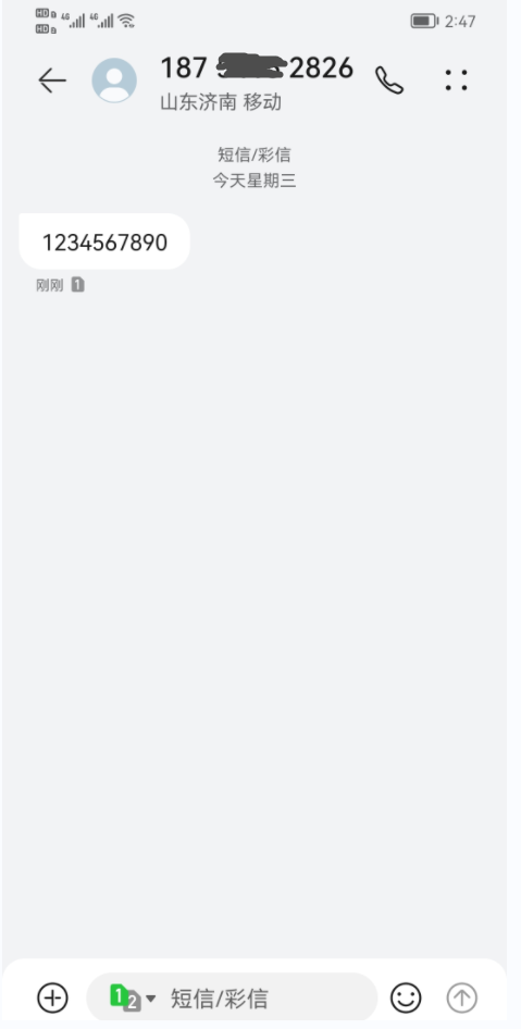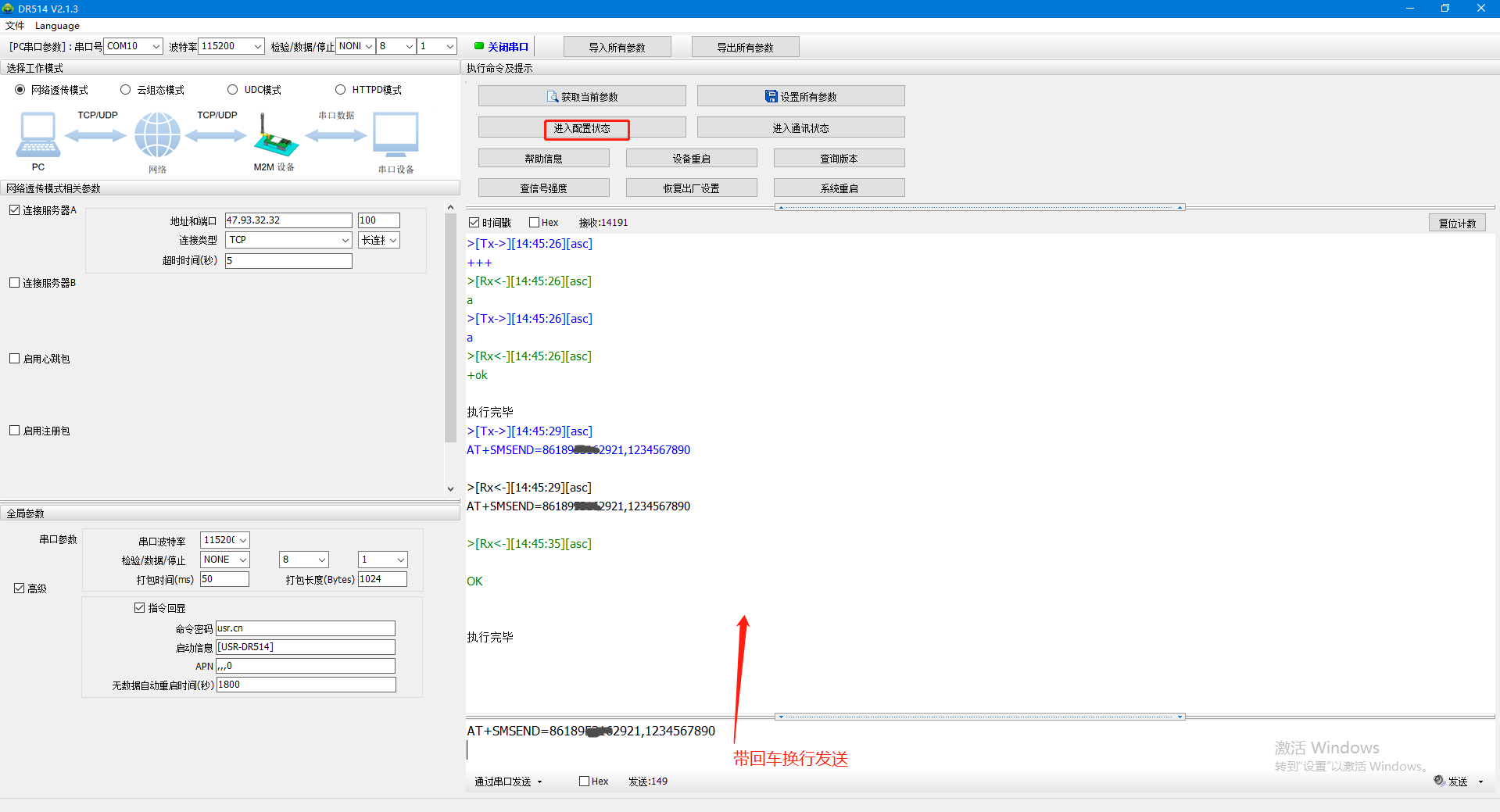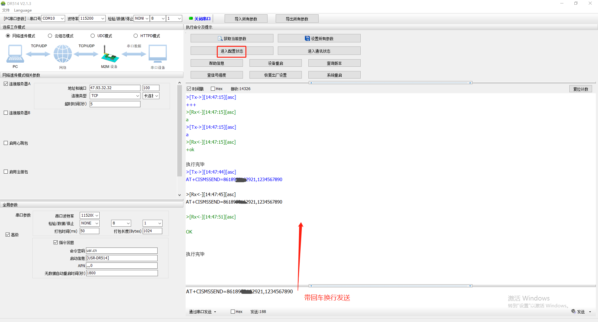 USR-DR514設(shè)置軟件發(fā)送AT+CISMSSEND=86手機(jī)號(hào),1234567890,AT指令后面帶回車(chē)換行發(fā)送,這個(gè)手機(jī)號(hào)的手機(jī)收到短信息,內(nèi)容是1234567890。