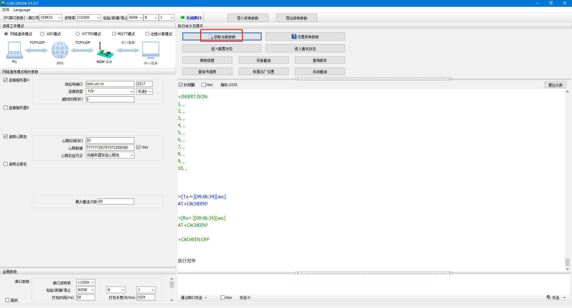 (1)USR-DR514,點(diǎn)擊進(jìn)入配置狀態(tài),點(diǎn)擊獲取當(dāng)前參數(shù),數(shù)據(jù)格式設(shè)置透?jìng)鳎c(diǎn)擊設(shè)置所有參數(shù),點(diǎn)擊設(shè)備重啟,最后關(guān)閉串口。